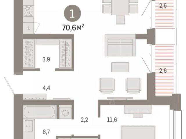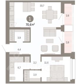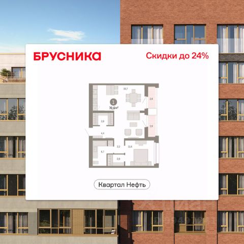 1-комн. квартира с предчистовой отделкой в ЖК "Нефть" на 16 этаже. Общая площадь: 70.6 кв.м., жилая: 11.6 кв.м., площадь просторной кухни-гостиной: 33.7 кв.м. Все окна выходят на одну сторону. В квартире две лоджии, один совмещенный санузел. Высота потолков 2.7 м. Дом монолитный, многоподъездный, переменной этажности, от 7 до 17 этажей. Квартира находится в 3-й секции высотой 17 этажей в корпусе 1. На этаже 8 квартир. В подъезде 1 пассажирский и 1 грузовой лифт. Окончание строительства - 2 квартал 2027 года. Оформление сделки по договору долевого участия. Квартира с кухней-гостиной и одной спальней в квартале "Нефть". Особенности планировки: гардеробная, ипотека 0,11%, лоджия, окна в пол, предчистовая отделка. квартиры в нашей базе: НФТ01-Ж3.16.3. Квартал "Нефть" построят в микрорайоне "нефтяников". Квартал состоит из четырёх жилых домов 7 — 9 этажей с акцентной башней в 17 этажей, подземными автостоянками и помещениями коммерческого назначения. Квартал находится в юго-западной части Сургута на пересечении Набережного проспекта и улицы Артёма. В районе уже сформированная инфраструктура. Рядом расположены три детских сада, университеты, парк и спортивная база. На первых этажах квартала спроектированы коммерческие помещения под повседневные сервисы для жителей: магазины, кафе, аптеки и другие полезные функции. Дом имеет переменную высотность 717 этажей. Секции высотой 7-9 этажей подразумевают небольшое количество соседей, спокойствие и приватность. Башня высотой в 17 этажей предлагает более динамичный характер проживания, здесь будет комфортно любителям активного городского ритма жизни. Дворы приватные и предназначены только для жителей. По стандартам Брусники зелень занимает 70% территории. В квартале "Нефть" озеленение выполнено по принципу долголетия ландшафта: оно плотное, разнообразное и многоярусное. Самый верхний ярус — взрослые деревья со сформированной кроной и высокие кустарники, ниже располагаются массивы кустарников среднего размера, нижний ярус — травы, многолетники и газон. Все растения подобраны с учётом сезонности и календаря цветения и сурового климата северного города. Осенью цвет ландшафта обеспечивает листва деревьев и кустарников, летом — цветение многолетников, зимой — вечнозелёные хвойные растения и кустарники с декоративными свойствами стеблей. Купить 1-комнатную квартиру площадью примерно 70 м2 (кв.м.) в Сургуте.