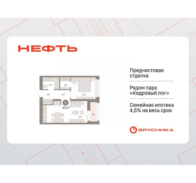 Просторная однокомнатная квартира с предчистовой отделкой в ЖК "Нефть" на 10 этаже. Общая площадь: 44.5 кв.м., жилая: 11.5 кв.м., площадь просторной кухни-гостиной: 21.7 кв.м. Все окна выходят на одну сторону. В квартире одна лоджия, один совмещенный санузел. Высота потолков 2.7 м. Дом монолитный, многоподъездный, переменной этажности, от 7 до 17 этажей. Квартира находится в 3-й секции высотой 17 этажей в корпусе 1. На этаже 8 квартир. В подъезде 1 пассажирский и 1 грузовой лифт. Окончание строительства - 2 квартал 2027 года. Оформление сделки по договору долевого участия. Квартира с кухней-гостиной и одной спальней в квартале "Нефть". Особенности планировки: вид во двор, лоджия, предчистовая отделка. квартиры в нашей базе: НФТ01-Ж3.10.8. Квартал "Нефть" построят в микрорайоне "нефтяников". Квартал состоит из четырёх жилых домов 7 — 9 этажей с акцентной башней в 17 этажей, подземными автостоянками и помещениями коммерческого назначения. Квартал находится в юго-западной части Сургута на пересечении Набережного проспекта и улицы Артёма. В районе уже сформированная инфраструктура. Рядом расположены три детских сада, университеты, парк и спортивная база. На первых этажах квартала спроектированы коммерческие помещения под повседневные сервисы для жителей: магазины, кафе, аптеки и другие полезные функции. Дом имеет переменную высотность 717 этажей. Секции высотой 7-9 этажей подразумевают небольшое количество соседей, спокойствие и приватность. Башня высотой в 17 этажей предлагает более динамичный характер проживания, здесь будет комфортно любителям активного городского ритма жизни. Дворы приватные и предназначены только для жителей. По стандартам Брусники зелень занимает 70% территории. В квартале "Нефть" озеленение выполнено по принципу долголетия ландшафта: оно плотное, разнообразное и многоярусное. Самый верхний ярус — взрослые деревья со сформированной кроной и высокие кустарники, ниже располагаются массивы кустарников среднего размера, нижний ярус — травы, многолетники и газон. Все растения подобраны с учётом сезонности и календаря цветения и сурового климата северного города. Осенью цвет ландшафта обеспечивает листва деревьев и кустарников, летом — цветение многолетников, зимой — вечнозелёные хвойные растения и кустарники с декоративными свойствами стеблей. #z5V9BO