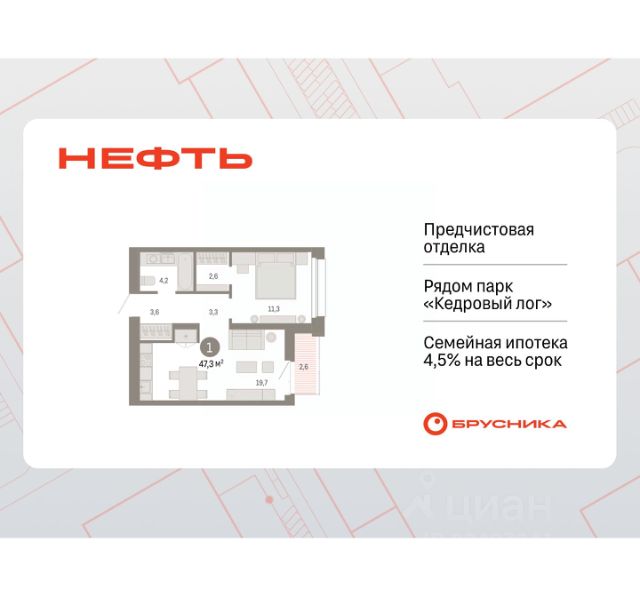 Просторная 1-комн. квартира с предчистовой отделкой в ЖК "Нефть" на 12 этаже. Общая площадь: 44.5 кв.м., жилая: 11.5 кв.м., площадь просторной кухни-гостиной: 21.7 кв.м. Все окна выходят на одну сторону. В квартире одна лоджия, один совмещенный санузел. Высота потолков 2.7 м. Дом монолитный, многоподъездный, переменной этажности, от 7 до 17 этажей. Квартира находится в 3-й секции высотой 17 этажей в корпусе 1. На этаже 8 квартир. В подъезде 1 пассажирский и 1 грузовой лифт. Окончание строительства - 2 квартал 2027 года. Оформление сделки по договору долевого участия. Квартира с кухней-гостиной и одной спальней в квартале "Нефть". Особенности планировки: вид во двор, лоджия, предчистовая отделка. квартиры в нашей базе: НФТ01-Ж3.12.8. Квартал "Нефть" построят в микрорайоне "нефтяников". Квартал состоит из четырёх жилых домов 7 — 9 этажей с акцентной башней в 17 этажей, подземными автостоянками и помещениями коммерческого назначения. Квартал находится в юго-западной части Сургута на пересечении Набережного проспекта и улицы Артёма. В районе уже сформированная инфраструктура. Рядом расположены три детских сада, университеты, парк и спортивная база. На первых этажах квартала спроектированы коммерческие помещения под повседневные сервисы для жителей: магазины, кафе, аптеки и другие полезные функции. Дом имеет переменную высотность 717 этажей. Секции высотой 7-9 этажей подразумевают небольшое количество соседей, спокойствие и приватность. Башня высотой в 17 этажей предлагает более динамичный характер проживания, здесь будет комфортно любителям активного городского ритма жизни. Дворы приватные и предназначены только для жителей. По стандартам Брусники зелень занимает 70% территории. В квартале "Нефть" озеленение выполнено по принципу долголетия ландшафта: оно плотное, разнообразное и многоярусное. Самый верхний ярус — взрослые деревья со сформированной кроной и высокие кустарники, ниже располагаются массивы кустарников среднего размера, нижний ярус — травы, многолетники и газон. Все растения подобраны с учётом сезонности и календаря цветения и сурового климата северного города. Осенью цвет ландшафта обеспечивает листва деревьев и кустарников, летом — цветение многолетников, зимой — вечнозелёные хвойные растения и кустарники с декоративными свойствами стеблей. #ZWcMT6