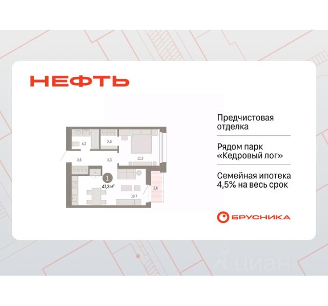 Продается однокомнатная квартира от застройщика с предчистовой отделкой в ЖК "Нефть" на 14 этаже. Общая площадь: 47.3 кв.м., жилая: 11.3 кв.м., площадь просторной кухни-гостиной: 19.7 кв.м. Все окна выходят на одну сторону. В квартире одна лоджия, один совмещенный санузел. Высота потолков 2.7 м. Дом монолитный, многоподъездный, переменной этажности, от 7 до 17 этажей. Квартира находится в 3-й секции высотой 17 этажей в корпусе 1. На этаже 8 квартир. В подъезде 1 пассажирский и 1 грузовой лифт. Окончание строительства - 2 квартал 2027 года. Оформление сделки по договору долевого участия. Квартира с кухней-гостиной и одной спальней в квартале "Нефть". Особенности планировки: гардеробная, лоджия, предчистовая отделка. квартиры в нашей базе: НФТ01-Ж3.14.3. Квартал "Нефть" построят в микрорайоне "нефтяников". Квартал состоит из четырёх жилых домов 7 — 9 этажей с акцентной башней в 17 этажей, подземными автостоянками и помещениями коммерческого назначения. Квартал находится в юго-западной части Сургута на пересечении Набережного проспекта и улицы Артёма. В районе уже сформированная инфраструктура. Рядом расположены три детских сада, университеты, парк и спортивная база. На первых этажах квартала спроектированы коммерческие помещения под повседневные сервисы для жителей: магазины, кафе, аптеки и другие полезные функции. Дом имеет переменную высотность 717 этажей. Секции высотой 7-9 этажей подразумевают небольшое количество соседей, спокойствие и приватность. Башня высотой в 17 этажей предлагает более динамичный характер проживания, здесь будет комфортно любителям активного городского ритма жизни. Дворы приватные и предназначены только для жителей. По стандартам Брусники зелень занимает 70% территории. В квартале "Нефть" озеленение выполнено по принципу долголетия ландшафта: оно плотное, разнообразное и многоярусное. Самый верхний ярус — взрослые деревья со сформированной кроной и высокие кустарники, ниже располагаются массивы кустарников среднего размера, нижний ярус — травы, многолетники и газон. Все растения подобраны с учётом сезонности и календаря цветения и сурового климата северного города. Осенью цвет ландшафта обеспечивает листва деревьев и кустарников, летом — цветение многолетников, зимой — вечнозелёные хвойные растения и кустарники с декоративными свойствами стеблей. #zwEt8F