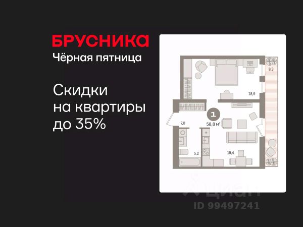Готовые квартиры со скидкой до 35%. Информация по телефону, наши менеджеры вам все расскажут! Продается 1-комн. квартира от застройщика с предчистовой отделкой в ЖК "Новин" на 2 этаже. Общая площадь: 58.83 кв.м., жилая: 18.9 кв.м., площадь просторной кухни-гостиной: 19.4 кв.м. Все окна выходят на одну сторону. В квартире один балкон, один совмещенный санузел. Терраса представляет собой роскошную зону отдыха, где вы на свой вкус можете создать атмосферу комфорта и уюта. Высота потолков 2.7 м. Дом монолитный, многоподъездный, переменной этажности, от 8 до 17 этажей. Квартира находится в 1-й секции высотой 15 этажей в корпусе 7. На этаже 7 квартир. В подъезде 1 пассажирский и 1 грузовой лифт. Окончание строительства - 2 квартал 2027 года. Оформление сделки по договору долевого участия. Квартира с кухней-гостиной и одной спальней в квартале "Новин". Особенности планировки: вид во двор, предчистовая отделка, балкон. квартиры в нашей базе: НСВ07-Ж1.2.7. Квартал "Новин" расположен на западе Сургута в районе с хорошо развитой инфраструктурой. Рядом — парк "Кедровый Лог", детские сады, поликлиника, продуктовые магазины и торговые центры. До центра города — 20 минут на автомобиле. Пять домов уже заселены. Ещё три находятся на этапе возведения. Квартал находится в западной части Сургута на пересечении Югорского тракта и улицы Игоря Киртбая. Можно быстро добраться до любой точки города по Югорскому тракту. В районе уже сформированная инфраструктура. Рядом расположены крупные торговые центры, три детских сада, поликлиника, парк и спортивная база. На первых этажах квартала спроектированы коммерческие помещения под повседневные сервисы для жителей: магазины, кафе, аптеки и другие полезные функции. Проектом развития территории предусмотрено строительство детского сада и общеобразовательной школы. Во дворах предусмотрены сценарии для разных категорий жителей, в том числе и площадки для тихого отдыха с фонтаном и арт объектом. Детская площадка раскрывает игровой потенциал территории за счёт разных возможных типов взаимодействий, среди которых присутствуют: контакт с природой, смена уровня игры и контролируемый риск, сотрудничество и игра в команде, а также спокойный сценарий с качелями. Между домами второй очереди мы спроектировали общественное пространство. Здесь также расположатся спортивные и игровые площадки, велопарковки и площадь событий. Главной точкой притяжения станет фонтан. #24eBv1