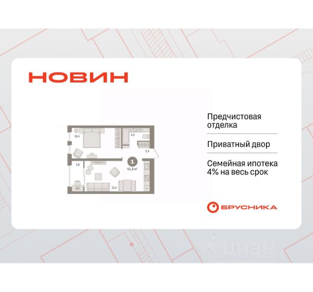 Готовые квартиры со скидкой до 35%. Информация по телефону, мы вам все подробно расскажем! Продается однокомнатная квартира от застройщика с предчистовой отделкой в ЖК "Новин" на 8 этаже. Общая площадь: 53.76 кв.м., жилая: 11.6 кв.м., площадь просторной кухни-гостиной: 23.2 кв.м. Квартира - распашонка, без проходных комнат, окна выходят на paзные стороны дома. В квартире одна лоджия, один совмещенный санузел. Высота потолков 2.7 м. Дом монолитный, многоподъездный, переменной этажности, от 8 до 17 этажей. Квартира находится в 5-й секции высотой 8 этажей в корпусе 7. На этаже 6 квартир. В подъезде 1 пассажирский и 1 грузовой лифт. Окончание строительства - 2 квартал 2027 года. Оформление сделки по договору долевого участия. Квартира с кухней-гостиной и одной спальней в квартале "Новин". Особенности планировки: окна на две стороны, вид во двор, предчистовая отделка, терраса на крыше. квартиры в нашей базе: НСВ07-Ж5.8.2. Квартал "Новин" расположен на западе Сургута в районе с хорошо развитой инфраструктурой. Рядом — парк "Кедровый Лог", детские сады, поликлиника, продуктовые магазины и торговые центры. До центра города — 20 минут на автомобиле. Пять домов уже заселены. Ещё три находятся на этапе возведения. Квартал находится в западной части Сургута на пересечении Югорского тракта и улицы Игоря Киртбая. Можно быстро добраться до любой точки города по Югорскому тракту. В районе уже сформированная инфраструктура. Рядом расположены крупные торговые центры, три детских сада, поликлиника, парк и спортивная база. На первых этажах квартала спроектированы коммерческие помещения под повседневные сервисы для жителей: магазины, кафе, аптеки и другие полезные функции. Проектом развития территории предусмотрено строительство детского сада и общеобразовательной школы. Во дворах предусмотрены сценарии для разных категорий жителей, в том числе и площадки для тихого отдыха с фонтаном и арт объектом. Детская площадка раскрывает игровой потенциал территории за счёт разных возможных типов взаимодействий, среди которых присутствуют: контакт с природой, смена уровня игры и контролируемый риск, сотрудничество и игра в команде, а также спокойный сценарий с качелями. Между домами второй очереди мы спроектировали общественное пространство. Здесь также расположатся спортивные и игровые площадки, велопарковки и площадь событий. Главной точкой притяжения станет фонтан. #z4eBvT