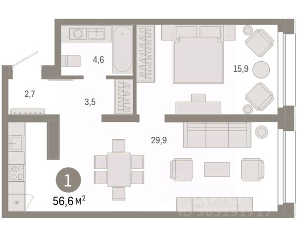 1-комн. квартира от застройщика с предчистовой отделкой в ЖК "Нефть" на 4 этаже. Общая площадь: 51.28 кв.м., жилая: 11.9 кв.м., площадь просторной кухни-гостиной: 26.4 кв.м. Все окна выходят на одну сторону. В квартире одна лоджия, один совмещенный санузел. Высота потолков 2.7 м. Дом монолитный, многоподъездный, переменной этажности, от 7 до 9 этажей. Квартира находится в 1-й секции высотой 7 этажей в корпусе 2. На этаже 10 квартир. В подъезде 1 пассажирский и 1 грузовой лифт. Окончание строительства - 3 квартал 2027 года. Оформление сделки по договору долевого участия. Квартира с кухней-гостиной и одной спальней в квартале "Нефть". Особенности планировки: гардеробная, лоджия, предчистовая отделка. квартиры в нашей базе: НФТ02-Ж1.4.6. Квартал "Нефть" построят в микрорайоне "нефтяников". Квартал состоит из четырёх жилых домов 7 — 9 этажей с акцентной башней в 17 этажей, подземными автостоянками и помещениями коммерческого назначения. Квартал находится в юго-западной части Сургута на пересечении Набережного проспекта и улицы Артёма. В районе уже сформированная инфраструктура. Рядом расположены три детских сада, университеты, парк и спортивная база. На первых этажах квартала спроектированы коммерческие помещения под повседневные сервисы для жителей: магазины, кафе, аптеки и другие полезные функции. Дом имеет переменную высотность 717 этажей. Секции высотой 7-9 этажей подразумевают небольшое количество соседей, спокойствие и приватность. Башня высотой в 17 этажей предлагает более динамичный характер проживания, здесь будет комфортно любителям активного городского ритма жизни. Дворы приватные и предназначены только для жителей. По стандартам Брусники зелень занимает 70% территории. В квартале "Нефть" озеленение выполнено по принципу долголетия ландшафта: оно плотное, разнообразное и многоярусное. Самый верхний ярус — взрослые деревья со сформированной кроной и высокие кустарники, ниже располагаются массивы кустарников среднего размера, нижний ярус — травы, многолетники и газон. Все растения подобраны с учётом сезонности и календаря цветения и сурового климата северного города. Осенью цвет ландшафта обеспечивает листва деревьев и кустарников, летом — цветение многолетников, зимой — вечнозелёные хвойные растения и кустарники с декоративными свойствами стеблей. #zSDovT