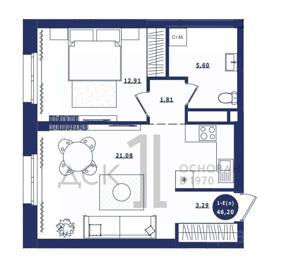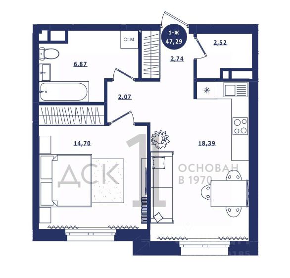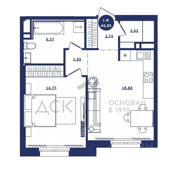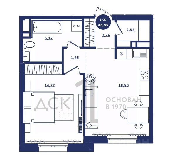 Продаётся 1-комнатная квартира в сданном доме (Дом 3 корпус 1,2), срок сдачи: IV-кв. 2023, общей площадью 46.85 кв.м., на 3 этаже. Новый жилой комплекс "Крылов" от застройщика "ДСК-1" расположен по адресу: г. Сургут, улица Крылова.