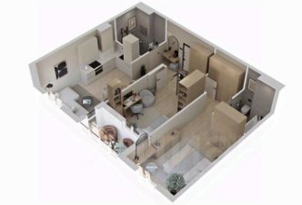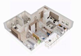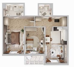 Квартира с кухней-гостиной и двумя спальнями в квартале "Новин". Особенности планировки: окна на две стороны, гардеробная, разнесённые спальни, предчистовая отделка, мастер-спальня, терраса, постирочная.