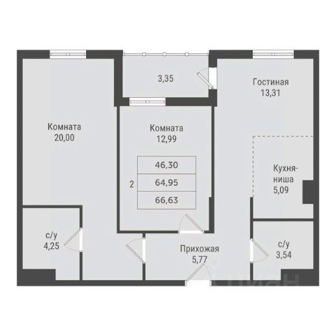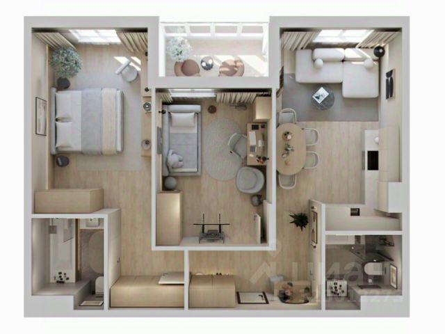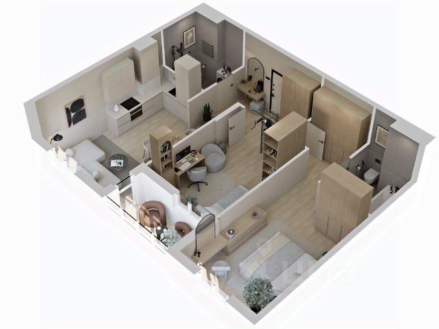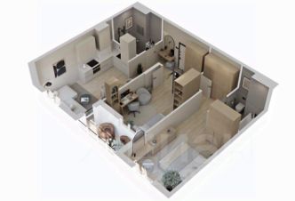 Квартира с кухней-гостиной и двумя спальнями в квартале "Новин". Особенности планировки: окна на две стороны, второй санузел, гардеробная, разнесённые спальни, предчистовая отделка, терраса.