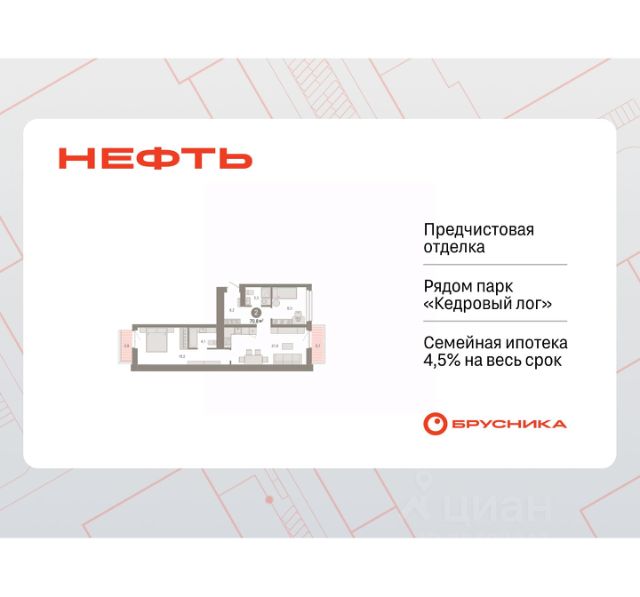 Двухкомнатная квартира с предчистовой отделкой в ЖК "Нефть" на 6 этаже. Общая площадь: 80.8 кв.м., жилая: 38 кв.м., площадь просторной кухни-гостиной: 26.6 кв.м. Квартира угловая, очень светлая, естественная вентиляция при открытии окон. В квартире две лоджии, два совмещенных санузла. Высота потолков 2.7 м. Дом монолитный, многоподъездный, переменной этажности, от 7 до 17 этажей. Квартира находится в 3-й секции высотой 17 этажей в корпусе 1. На этаже 8 квартир. В подъезде 1 пассажирский и 1 грузовой лифт. Окончание строительства - 2 квартал 2027 года. Оформление сделки по договору долевого участия. Квартира с кухней-гостиной и двумя спальнями в квартале "Нефть". Особенности планировки: лоджия, мастер-спальня, предчистовая отделка, разнесённые спальни. квартиры в нашей базе: НФТ01-Ж3.6.2. Квартал "Нефть" построят в микрорайоне "нефтяников". Квартал состоит из четырёх жилых домов 7 — 9 этажей с акцентной башней в 17 этажей, подземными автостоянками и помещениями коммерческого назначения. Квартал находится в юго-западной части Сургута на пересечении Набережного проспекта и улицы Артёма. В районе уже сформированная инфраструктура. Рядом расположены три детских сада, университеты, парк и спортивная база. На первых этажах квартала спроектированы коммерческие помещения под повседневные сервисы для жителей: магазины, кафе, аптеки и другие полезные функции. Дом имеет переменную высотность 717 этажей. Секции высотой 7-9 этажей подразумевают небольшое количество соседей, спокойствие и приватность. Башня высотой в 17 этажей предлагает более динамичный характер проживания, здесь будет комфортно любителям активного городского ритма жизни. Дворы приватные и предназначены только для жителей. По стандартам Брусники зелень занимает 70% территории. В квартале "Нефть" озеленение выполнено по принципу долголетия ландшафта: оно плотное, разнообразное и многоярусное. Самый верхний ярус — взрослые деревья со сформированной кроной и высокие кустарники, ниже располагаются массивы кустарников среднего размера, нижний ярус — травы, многолетники и газон. Все растения подобраны с учётом сезонности и календаря цветения и сурового климата северного города. Осенью цвет ландшафта обеспечивает листва деревьев и кустарников, летом — цветение многолетников, зимой — вечнозелёные хвойные растения и кустарники с декоративными свойствами стеблей. #zWBFud