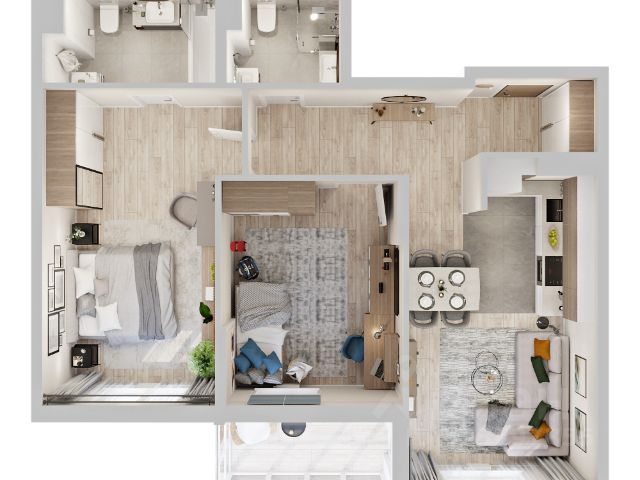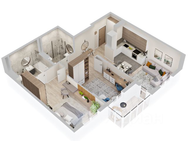 Квартира с кухней-гостиной и двумя спальнями в квартале "Новин". Особенности планировки: балкон, предчистовая отделка, разнесённые спальни.