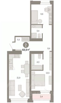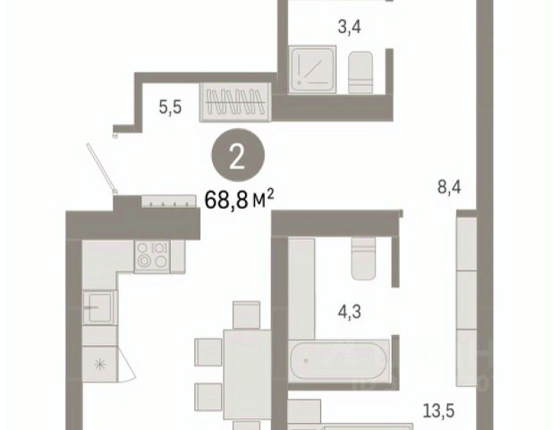Квартира с кухней-гостиной и двумя спальнями в квартале "Новин". Особенности планировки: окна на две стороны, гардеробная, разнесённые спальни, предчистовая отделка, мастер-спальня, терраса, постирочная.