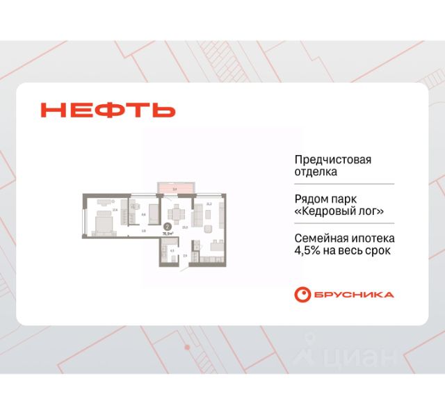 2-комн. квартира с предчистовой отделкой в ЖК "Нефть" на 2 этаже. Общая площадь: 70.28 кв.м., жилая: 23.1 кв.м., площадь просторной кухни-гостиной: 21.9 кв.м. Квартира - распашонка, без проходных комнат, окна выходят на paзные стороны дома. В квартире два совмещенных санузла. Высота потолков 2.7 м. Дом монолитный, многоподъездный, переменной этажности, от 7 до 9 этажей. Квартира находится в 4-й секции высотой 9 этажей в корпусе 2. На этаже 6 квартир. В подъезде 1 пассажирский и 1 грузовой лифт. Окончание строительства - 3 квартал 2027 года. Оформление сделки по договору долевого участия. Квартира с кухней-гостиной и двумя спальнями в квартале "Нефть". Особенности планировки: окна на две стороны, гардеробная, вид во двор, разнесённые спальни, предчистовая отделка, мастер-спальня. квартиры в нашей базе: НФТ02-Ж4.2.4. Квартал "Нефть" построят в микрорайоне "нефтяников". Квартал состоит из четырёх жилых домов 7 — 9 этажей с акцентной башней в 17 этажей, подземными автостоянками и помещениями коммерческого назначения. Квартал находится в юго-западной части Сургута на пересечении Набережного проспекта и улицы Артёма. В районе уже сформированная инфраструктура. Рядом расположены три детских сада, университеты, парк и спортивная база. На первых этажах квартала спроектированы коммерческие помещения под повседневные сервисы для жителей: магазины, кафе, аптеки и другие полезные функции. Дом имеет переменную высотность 717 этажей. Секции высотой 7-9 этажей подразумевают небольшое количество соседей, спокойствие и приватность. Башня высотой в 17 этажей предлагает более динамичный характер проживания, здесь будет комфортно любителям активного городского ритма жизни. Дворы приватные и предназначены только для жителей. По стандартам Брусники зелень занимает 70% территории. В квартале "Нефть" озеленение выполнено по принципу долголетия ландшафта: оно плотное, разнообразное и многоярусное. Самый верхний ярус — взрослые деревья со сформированной кроной и высокие кустарники, ниже располагаются массивы кустарников среднего размера, нижний ярус — травы, многолетники и газон. Все растения подобраны с учётом сезонности и календаря цветения и сурового климата северного города. Осенью цвет ландшафта обеспечивает листва деревьев и кустарников, летом — цветение многолетников, зимой — вечнозелёные хвойные растения и кустарники с декоративными свойствами стеблей. #25d0tO