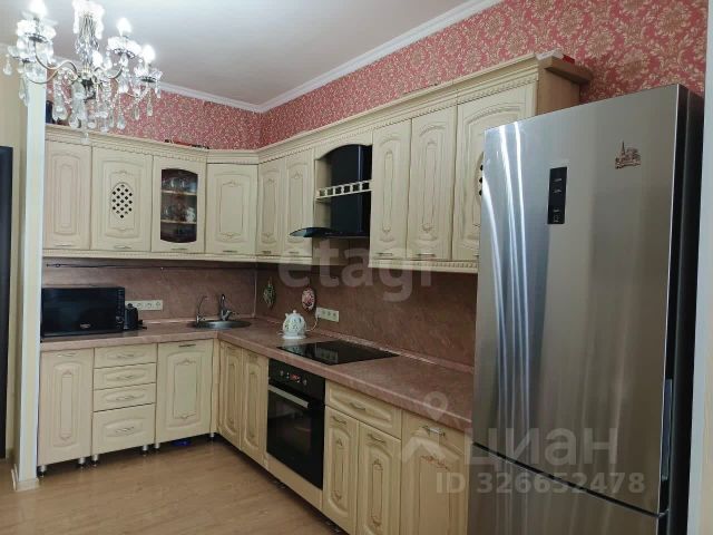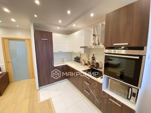 Куxня-гocтиная: стены декоративная штукатурка, покрытие полoв паркетная доска, керамогранит в кухонной зоне; потолок двухуровневый, выполнен из ГКЛ, оштукатурен. В кухонной зоне расположена барная стойка с островком (варочная поверхность на 4-е комфорки, духовой шкаф, два шкафчика, два барных стула). Отдельное освещение точечными светильниками кухонной зоны, отдельные светильники на барной стойке, гостиной, подсветка между уровнями потолка, два настенных светильника (бра), все освещение включается отдельно друг от друга. Над барной стойкой с островком установлена современная вытяжка (цилиндрической формы). В кухонной зоне современный кухонный гарнитур со встроенным холодильником.