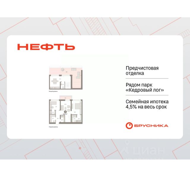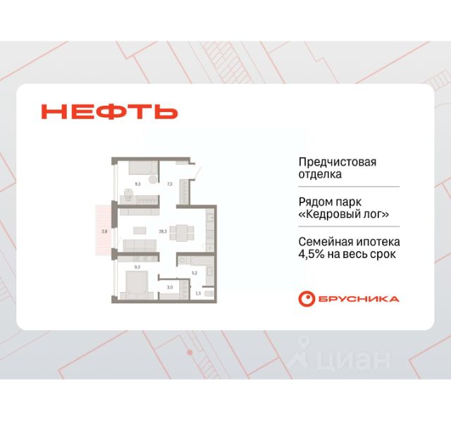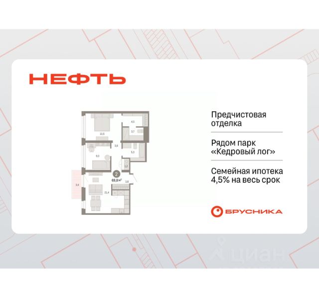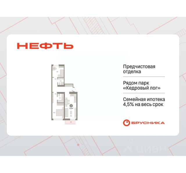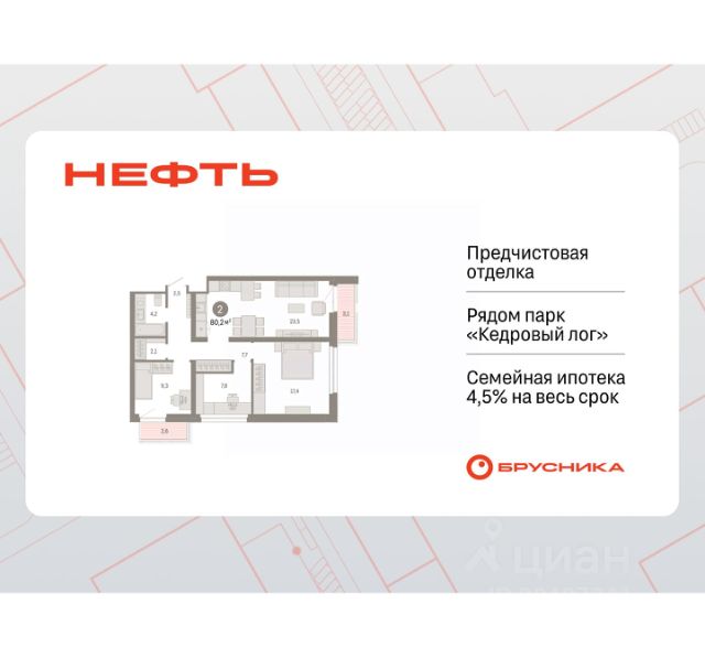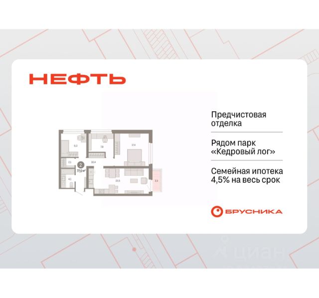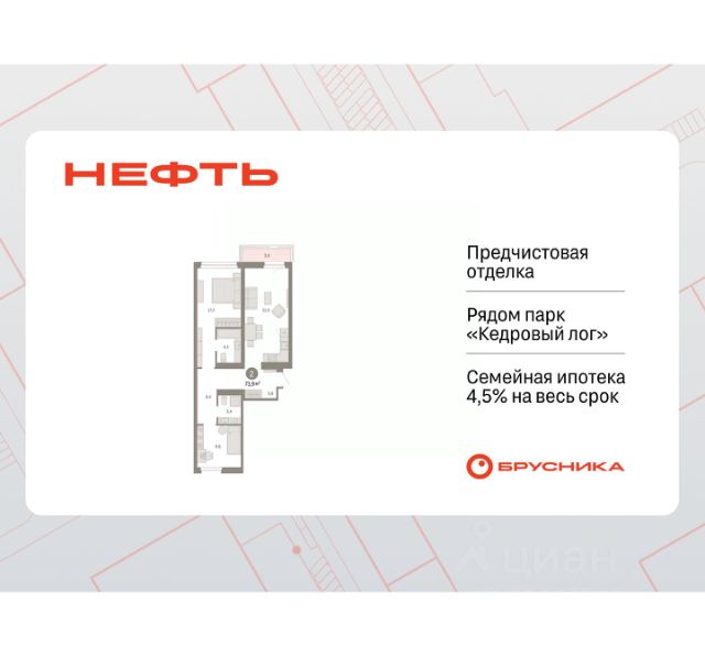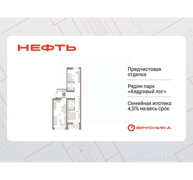 Просторная 2-комн. квартира с предчистовой отделкой в ЖК "Нефть" на 5 этаже. Общая площадь: 61.62 кв.м., жилая: 21.6 кв.м., площадь просторной кухни-гостиной: 17.1 кв.м. Комнаты изолированные, все окна выходят на одну сторону. В квартире две лоджии, два совмещенных санузла. Высота потолков 2.7 м. Дом монолитный, многоподъездный, переменной этажности, от 7 до 9 этажей. Квартира находится в 6-й секции высотой 9 этажей в корпусе 2. На этаже 5 квартир. В подъезде 1 пассажирский и 1 грузовой лифт. Окончание строительства - 3 квартал 2027 года. Оформление сделки по договору долевого участия. Квартира с кухней-гостиной и двумя спальнями в квартале "Нефть". Особенности планировки: гардеробная, лоджия, мастер-спальня, предчистовая отделка, разнесённые спальни. квартиры в нашей базе: НФТ02-Ж6.5.3. Квартал "Нефть" построят в микрорайоне "нефтяников". Квартал состоит из четырёх жилых домов 7 — 9 этажей с акцентной башней в 17 этажей, подземными автостоянками и помещениями коммерческого назначения. Квартал находится в юго-западной части Сургута на пересечении Набережного проспекта и улицы Артёма. В районе уже сформированная инфраструктура. Рядом расположены три детских сада, университеты, парк и спортивная база. На первых этажах квартала спроектированы коммерческие помещения под повседневные сервисы для жителей: магазины, кафе, аптеки и другие полезные функции. Дом имеет переменную высотность 717 этажей. Секции высотой 7-9 этажей подразумевают небольшое количество соседей, спокойствие и приватность. Башня высотой в 17 этажей предлагает более динамичный характер проживания, здесь будет комфортно любителям активного городского ритма жизни. Дворы приватные и предназначены только для жителей. По стандартам Брусники зелень занимает 70% территории. В квартале "Нефть" озеленение выполнено по принципу долголетия ландшафта: оно плотное, разнообразное и многоярусное. Самый верхний ярус — взрослые деревья со сформированной кроной и высокие кустарники, ниже располагаются массивы кустарников среднего размера, нижний ярус — травы, многолетники и газон. Все растения подобраны с учётом сезонности и календаря цветения и сурового климата северного города. Осенью цвет ландшафта обеспечивает листва деревьев и кустарников, летом — цветение многолетников, зимой — вечнозелёные хвойные растения и кустарники с декоративными свойствами стеблей. #z5DOz6