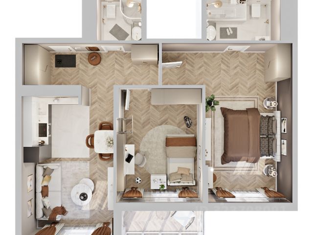 Квартира с кухней-гостиной и двумя спальнями в квартале "Нефть". Особенности планировки: окна на две стороны, гардеробная, вид во двор, разнесённые спальни, предчистовая отделка, мастер-спальня, балкон.