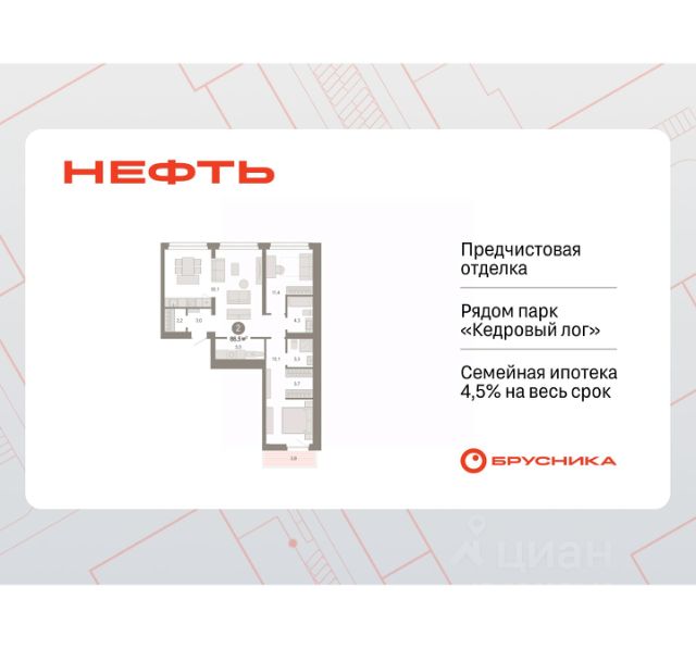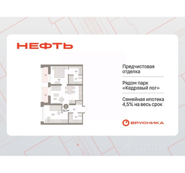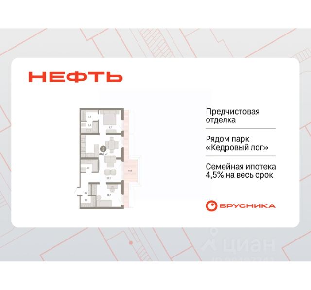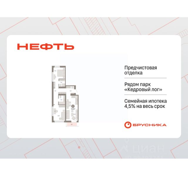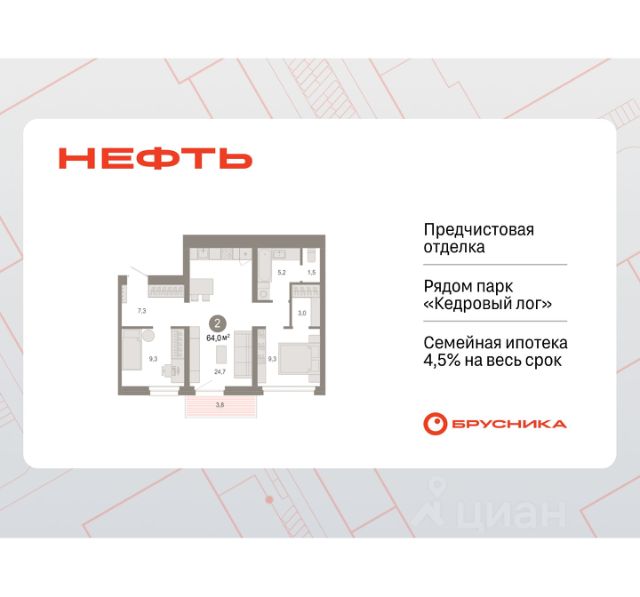Просторная двухкомнатная квартира с предчистовой отделкой в ЖК "Нефть" на 7 этаже. Общая площадь: 64.04 кв.м., жилая: 18.6 кв.м., площадь просторной кухни-гостиной: 24.7 кв.м. Комнаты изолированные, все окна выходят на одну сторону. В квартире один балкон, один совмещенный санузел. Высота потолков 2.7 м. Дом монолитный, многоподъездный, переменной этажности, от 7 до 9 этажей. Квартира находится в 1-й секции высотой 7 этажей в корпусе 2. На этаже 10 квартир. В подъезде 1 пассажирский и 1 грузовой лифт. Окончание строительства - 3 квартал 2027 года. Оформление сделки по договору долевого участия. Квартира с кухней-гостиной и двумя спальнями в квартале "Нефть". Особенности планировки: гардеробная, вид во двор, разнесённые спальни, предчистовая отделка, балкон. квартиры в нашей базе: НФТ02-Ж1.7.7. Квартал "Нефть" построят в микрорайоне "нефтяников". Квартал состоит из четырёх жилых домов 7 — 9 этажей с акцентной башней в 17 этажей, подземными автостоянками и помещениями коммерческого назначения. Квартал находится в юго-западной части Сургута на пересечении Набережного проспекта и улицы Артёма. В районе уже сформированная инфраструктура. Рядом расположены три детских сада, университеты, парк и спортивная база. На первых этажах квартала спроектированы коммерческие помещения под повседневные сервисы для жителей: магазины, кафе, аптеки и другие полезные функции. Дом имеет переменную высотность 717 этажей. Секции высотой 7-9 этажей подразумевают небольшое количество соседей, спокойствие и приватность. Башня высотой в 17 этажей предлагает более динамичный характер проживания, здесь будет комфортно любителям активного городского ритма жизни. Дворы приватные и предназначены только для жителей. По стандартам Брусники зелень занимает 70% территории. В квартале "Нефть" озеленение выполнено по принципу долголетия ландшафта: оно плотное, разнообразное и многоярусное. Самый верхний ярус — взрослые деревья со сформированной кроной и высокие кустарники, ниже располагаются массивы кустарников среднего размера, нижний ярус — травы, многолетники и газон. Все растения подобраны с учётом сезонности и календаря цветения и сурового климата северного города. Осенью цвет ландшафта обеспечивает листва деревьев и кустарников, летом — цветение многолетников, зимой — вечнозелёные хвойные растения и кустарники с декоративными свойствами стеблей. #25d0od