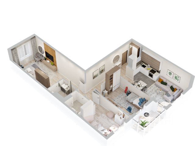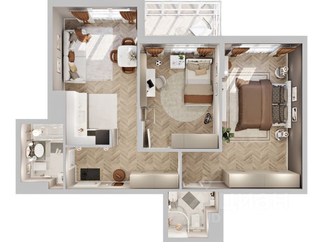 Квартира с кухней-гостиной и двумя спальнями в квартале "Новин". Особенности планировки: окна на две стороны, гардеробная, разнесённые спальни, предчистовая отделка, мастер-спальня, терраса, постирочная.