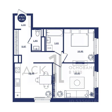 Квартира с кухней-гостиной и двумя спальнями в квартале "Новин". Особенности планировки: окна на две стороны, гардеробная, разнесённые спальни, предчистовая отделка, мастер-спальня, терраса, постирочная.