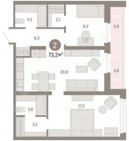 Продается двухкомнатная квартира от застройщика с первичной отделкой в ЖК "Нефть" на 8 этаже. Общая площадь: 73.22 кв.м., жилая: 26.6 кв.м., площадь просторной кухни-гостиной: 20.8 кв.м. Комнаты изолированные, все окна выходят на одну сторону. В квартире две лоджии, два совмещенных санузла. Высота потолков 2.7 м. Дом монолитный, многоподъездный, переменной этажности, от 7 до 9 этажей. Квартира находится в 3-й секции высотой 9 этажей в корпусе 2. На этаже 8 квартир. В подъезде 1 пассажирский и 1 грузовой лифт. Окончание строительства - 3 квартал 2027 года. Оформление сделки по договору долевого участия. Квартира с кухней-гостиной и двумя спальнями в квартале "Нефть". Особенности планировки: гардеробная, разнесённые спальни, предчистовая отделка, мастер-спальня, балкон. квартиры в нашей базе: НФТ02-Ж3.8.6. Квартал "Нефть" построят в микрорайоне "нефтяников". Квартал состоит из четырёх жилых домов 7 — 9 этажей с акцентной башней в 17 этажей, подземными автостоянками и помещениями коммерческого назначения. Квартал находится в юго-западной части Сургута на пересечении Набережного проспекта и улицы Артёма. В районе уже сформированная инфраструктура. Рядом расположены три детских сада, университеты, парк и спортивная база. На первых этажах квартала спроектированы коммерческие помещения под повседневные сервисы для жителей: магазины, кафе, аптеки и другие полезные функции. Дом имеет переменную высотность 717 этажей. Секции высотой 7-9 этажей подразумевают небольшое количество соседей, спокойствие и приватность. Башня высотой в 17 этажей предлагает более динамичный характер проживания, здесь будет комфортно любителям активного городского ритма жизни. Дворы приватные и предназначены только для жителей. По стандартам Брусники зелень занимает 70% территории. В квартале "Нефть" озеленение выполнено по принципу долголетия ландшафта: оно плотное, разнообразное и многоярусное. Самый верхний ярус — взрослые деревья со сформированной кроной и высокие кустарники, ниже располагаются массивы кустарников среднего размера, нижний ярус — травы, многолетники и газон. Все растения подобраны с учётом сезонности и календаря цветения и сурового климата северного города. Осенью цвет ландшафта обеспечивает листва деревьев и кустарников, летом — цветение многолетников, зимой — вечнозелёные хвойные растения и кустарники с декоративными свойствами стеблей. #zSD0Og Продается 2-комнатная квартира с лоджией в Сургуте.