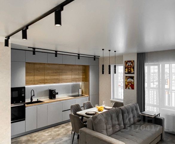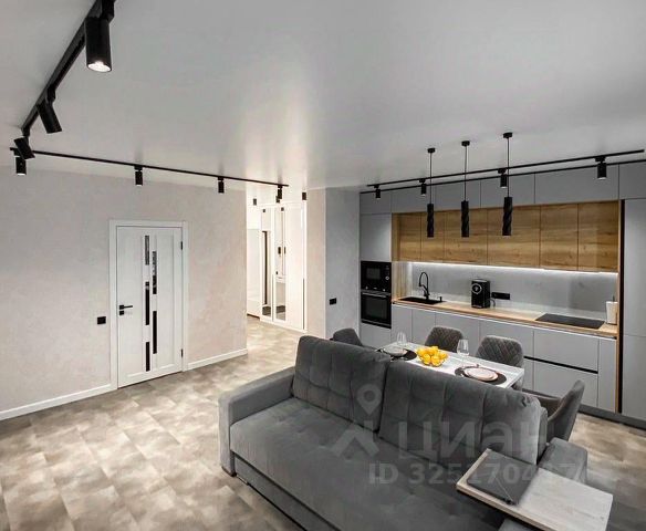 Вся квартира оборудована техникой для комфортного проживания: два телевизора (55 и 65 дюймов), стиральная и сушильная машинки, встроенная микроволновая печь, духовка, холодильник, варочная панель, вытяжка и посудомоечная машинка на 60.