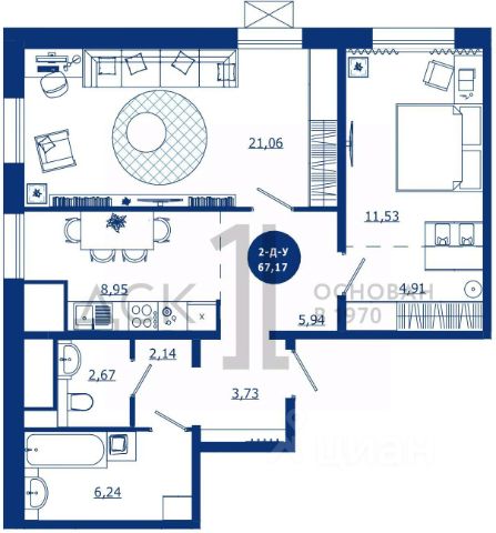 Квартира имеет следующую планировку: при входе коридор переходящий в кухню гостиную, а на лево шкаф -купе, за которым гардеробная и постирочная, по коридору на лево по правую сторону два санузла 9один с душевой, второй с ванной). И прямо по коридору вход в спальную справа и вход в комнату отдыха слева, из которой выход на прекрасный вышеописанный балкон.