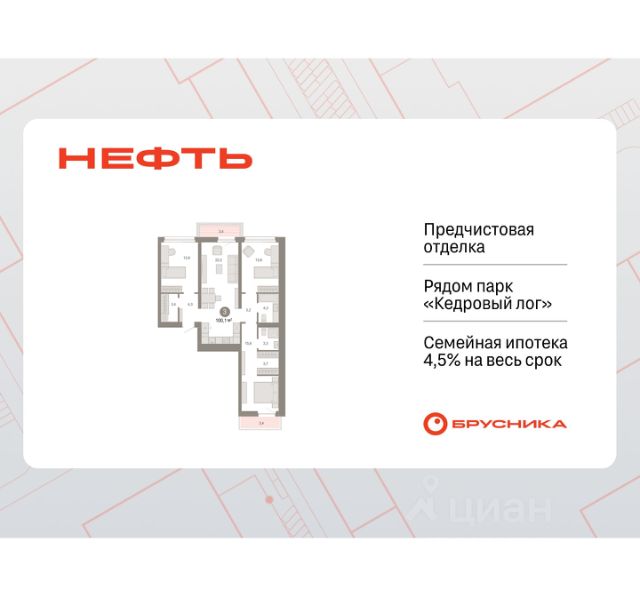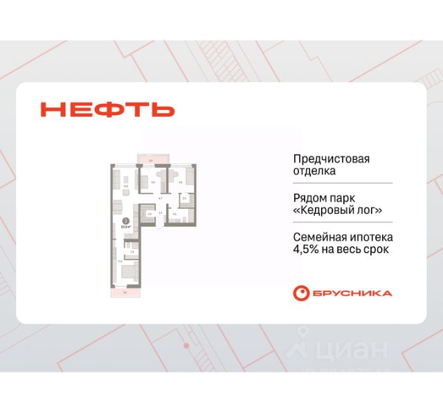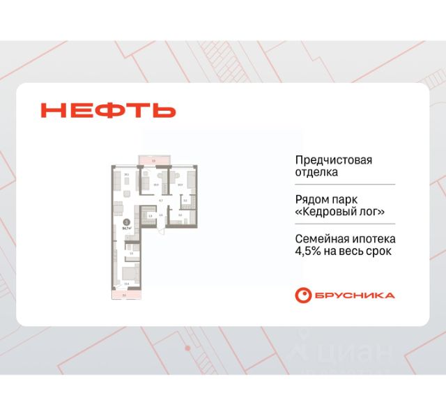 Продается 3-комн. квартира от застройщика с предчистовой отделкой в ЖК "Нефть" на 5 этаже. Общая площадь: 94.08 кв.м., жилая: 32.1 кв.м., площадь просторной кухни-гостиной: 24.9 кв.м. Квартира - распашонка, без проходных комнат, окна выходят на paзные стороны дома. В квартире два балкона, два совмещенных санузла. Высота потолков 2.7 м. Дом монолитный, многоподъездный, переменной этажности, от 7 до 9 этажей. Квартира находится в 4-й секции высотой 9 этажей в корпусе 2. На этаже 6 квартир. В подъезде 1 пассажирский и 1 грузовой лифт. Окончание строительства - 3 квартал 2027 года. Оформление сделки по договору долевого участия. Квартира с кухней-гостиной и тремя спальнями в квартале "Нефть". Особенности планировки: окна на две стороны, гардеробная, вид во двор, лоджия, разнесённые спальни, предчистовая отделка, мастер-спальня, балкон. квартиры в нашей базе: НФТ02-Ж4.5.1. Квартал "Нефть" построят в микрорайоне "нефтяников". Квартал состоит из четырёх жилых домов 7 — 9 этажей с акцентной башней в 17 этажей, подземными автостоянками и помещениями коммерческого назначения. Квартал находится в юго-западной части Сургута на пересечении Набережного проспекта и улицы Артёма. В районе уже сформированная инфраструктура. Рядом расположены три детских сада, университеты, парк и спортивная база. На первых этажах квартала спроектированы коммерческие помещения под повседневные сервисы для жителей: магазины, кафе, аптеки и другие полезные функции. Дом имеет переменную высотность 717 этажей. Секции высотой 7-9 этажей подразумевают небольшое количество соседей, спокойствие и приватность. Башня высотой в 17 этажей предлагает более динамичный характер проживания, здесь будет комфортно любителям активного городского ритма жизни. Дворы приватные и предназначены только для жителей. По стандартам Брусники зелень занимает 70% территории. В квартале "Нефть" озеленение выполнено по принципу долголетия ландшафта: оно плотное, разнообразное и многоярусное. Самый верхний ярус — взрослые деревья со сформированной кроной и высокие кустарники, ниже располагаются массивы кустарников среднего размера, нижний ярус — травы, многолетники и газон. Все растения подобраны с учётом сезонности и календаря цветения и сурового климата северного города. Осенью цвет ландшафта обеспечивает листва деревьев и кустарников, летом — цветение многолетников, зимой — вечнозелёные хвойные растения и кустарники с декоративными свойствами стеблей. #2sDowg