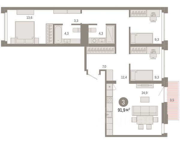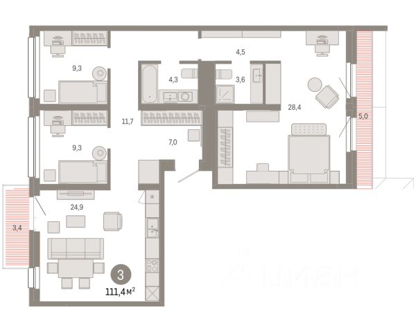 Просторная трехкомнатная квартира с предчистовой отделкой в ЖК "Нефть" на 9 этаже. Общая площадь: 111.4 кв.м., жилая: 47 кв.м., площадь просторной кухни-гостиной: 24.9 кв.м. Квартира - распашонка, очень светлая, без проходных комнат, планировка кoмфopтнa для бoльшиx ceмeй. В квартире один балкон и одна лоджия, два совмещенных санузла. Высота потолков 2.7 м. Дом монолитный, многоподъездный, переменной этажности, от 7 до 17 этажей. Квартира находится в 4-й секции высотой 9 этажей в корпусе 1. На этаже 6 квартир. В подъезде 1 пассажирский и 1 грузовой лифт. Окончание строительства - 2 квартал 2027 года. Оформление сделки по договору долевого участия. Квартира с кухней-гостиной и тремя спальнями в квартале "Нефть". Особенности планировки: вид во двор, разнесённые спальни, предчистовая отделка, мастер-спальня, балкон, терраса на крыше. квартиры в нашей базе: НФТ01-Ж4.9.1. Квартал "Нефть" построят в микрорайоне "нефтяников". Квартал состоит из четырёх жилых домов 7 — 9 этажей с акцентной башней в 17 этажей, подземными автостоянками и помещениями коммерческого назначения. Квартал находится в юго-западной части Сургута на пересечении Набережного проспекта и улицы Артёма. В районе уже сформированная инфраструктура. Рядом расположены три детских сада, университеты, парк и спортивная база. На первых этажах квартала спроектированы коммерческие помещения под повседневные сервисы для жителей: магазины, кафе, аптеки и другие полезные функции. Дом имеет переменную высотность 717 этажей. Секции высотой 7-9 этажей подразумевают небольшое количество соседей, спокойствие и приватность. Башня высотой в 17 этажей предлагает более динамичный характер проживания, здесь будет комфортно любителям активного городского ритма жизни. Дворы приватные и предназначены только для жителей. По стандартам Брусники зелень занимает 70% территории. В квартале "Нефть" озеленение выполнено по принципу долголетия ландшафта: оно плотное, разнообразное и многоярусное. Самый верхний ярус — взрослые деревья со сформированной кроной и высокие кустарники, ниже располагаются массивы кустарников среднего размера, нижний ярус — травы, многолетники и газон. Все растения подобраны с учётом сезонности и календаря цветения и сурового климата северного города. Осенью цвет ландшафта обеспечивает листва деревьев и кустарников, летом — цветение многолетников, зимой — вечнозелёные хвойные растения и кустарники с декоративными свойствами стеблей. #ZwBfz9
