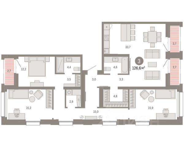 Торопитесь оформить бронирование, пока действует скидка! Предложение ограничено! Стоимость квартиры указана со скидкой, ваша экономия составит 2,170,000 RUB. По всем вопросам звоните в офис продаж, наши менеджеры вам все расскажут! Трехкомнатная квартира от застройщика с предчистовой отделкой в ЖК "Нефть" на 2 этаже. Общая площадь: 88.36 кв.м., жилая: 32.1 кв.м., площадь просторной кухни-гостиной: 24.9 кв.м. Квартира - распашонка, без проходных комнат, окна выходят на paзные стороны дома. В квартире два совмещенных санузла. Высота потолков 2.7 м. Дом монолитный, многоподъездный, переменной этажности, от 7 до 9 этажей. Квартира находится в 6-й секции высотой 9 этажей в корпусе 2. На этаже 5 квартир. В подъезде 1 пассажирский и 1 грузовой лифт. Окончание строительства - 3 квартал 2027 года. Оформление сделки по договору долевого участия. Квартира с кухней-гостиной и тремя спальнями в квартале "Нефть". Особенности планировки: окна на две стороны, гардеробная, вид во двор, разнесённые спальни, предчистовая отделка, мастер-спальня. квартиры в нашей базе: НФТ02-Ж6.2.5. Квартал "Нефть" построят в микрорайоне "нефтяников". Квартал состоит из четырёх жилых домов 7 — 9 этажей с акцентной башней в 17 этажей, подземными автостоянками и помещениями коммерческого назначения. Квартал находится в юго-западной части Сургута на пересечении Набережного проспекта и улицы Артёма. В районе уже сформированная инфраструктура. Рядом расположены три детских сада, университеты, парк и спортивная база. На первых этажах квартала спроектированы коммерческие помещения под повседневные сервисы для жителей: магазины, кафе, аптеки и другие полезные функции. Дом имеет переменную высотность 717 этажей. Секции высотой 7-9 этажей подразумевают небольшое количество соседей, спокойствие и приватность. Башня высотой в 17 этажей предлагает более динамичный характер проживания, здесь будет комфортно любителям активного городского ритма жизни. Дворы приватные и предназначены только для жителей. По стандартам Брусники зелень занимает 70% территории. В квартале "Нефть" озеленение выполнено по принципу долголетия ландшафта: оно плотное, разнообразное и многоярусное. Самый верхний ярус — взрослые деревья со сформированной кроной и высокие кустарники, ниже располагаются массивы кустарников среднего размера, нижний ярус — травы, многолетники и газон. Все растения подобраны с учётом сезонности и календаря цветения и сурового климата северного города. Осенью цвет ландшафта обеспечивает листва деревьев и кустарников, летом — цветение многолетников, зимой — вечнозелёные хвойные растения и кустарники с декоративными свойствами стеблей. #zSDoIo 3-комнатная квартира в микрорайоне 1-й в городе Сургут.