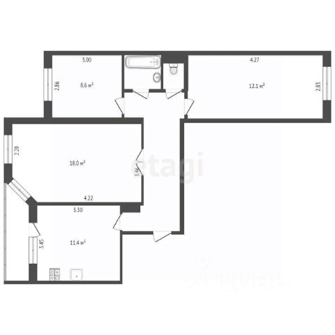 Общая площадь: 56,6 м² + лоджия