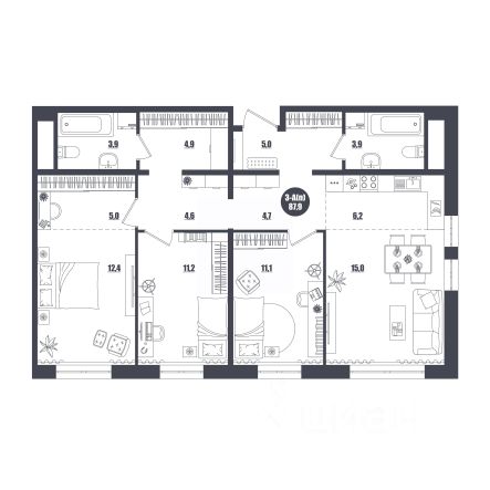 Просторная двухкомнатная квартира с предчистовой отделкой в ЖК "Нефть" на 4 этаже. Общая площадь: 61.68 кв.м., жилая: 21.7 кв.м., площадь просторной кухни-гостиной: 17.2 кв.м. Комнаты изолированные, все окна выходят на одну сторону. В квартире две лоджии, два совмещенных санузла. Высота потолков 2.7 м. Дом монолитный, многоподъездный, переменной этажности, от 7 до 9 этажей. Квартира находится в 6-й секции высотой 9 этажей в корпусе 2. На этаже 5 квартир. В подъезде 1 пассажирский и 1 грузовой лифт. Окончание строительства - 3 квартал 2027 года. Оформление сделки по договору долевого участия. Квартира с кухней-гостиной и двумя спальнями в квартале "Нефть". Особенности планировки: предчистовая отделка, разнесённые спальни. квартиры в нашей базе: НФТ02-Ж6.4.3. Квартал "Нефть" построят в микрорайоне "нефтяников". Квартал состоит из четырёх жилых домов 7 — 9 этажей с акцентной башней в 17 этажей, подземными автостоянками и помещениями коммерческого назначения. Квартал находится в юго-западной части Сургута на пересечении Набережного проспекта и улицы Артёма. В районе уже сформированная инфраструктура. Рядом расположены три детских сада, университеты, парк и спортивная база. На первых этажах квартала спроектированы коммерческие помещения под повседневные сервисы для жителей: магазины, кафе, аптеки и другие полезные функции. Дом имеет переменную высотность 717 этажей. Секции высотой 7-9 этажей подразумевают небольшое количество соседей, спокойствие и приватность. Башня высотой в 17 этажей предлагает более динамичный характер проживания, здесь будет комфортно любителям активного городского ритма жизни. Дворы приватные и предназначены только для жителей. По стандартам Брусники зелень занимает 70% территории. В квартале "Нефть" озеленение выполнено по принципу долголетия ландшафта: оно плотное, разнообразное и многоярусное. Самый верхний ярус — взрослые деревья со сформированной кроной и высокие кустарники, ниже располагаются массивы кустарников среднего размера, нижний ярус — травы, многолетники и газон. Все растения подобраны с учётом сезонности и календаря цветения и сурового климата северного города. Осенью цвет ландшафта обеспечивает листва деревьев и кустарников, летом — цветение многолетников, зимой — вечнозелёные хвойные растения и кустарники с декоративными свойствами стеблей. #z6awgT