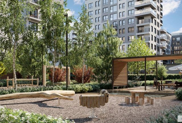 Во дворах предусмотрены сценарии для разных категорий жителей, в том числе и площадки для тихого отдыха с фонтаном и арт объектом.