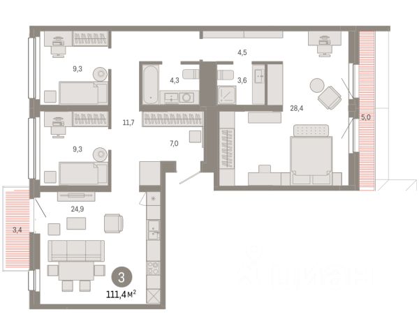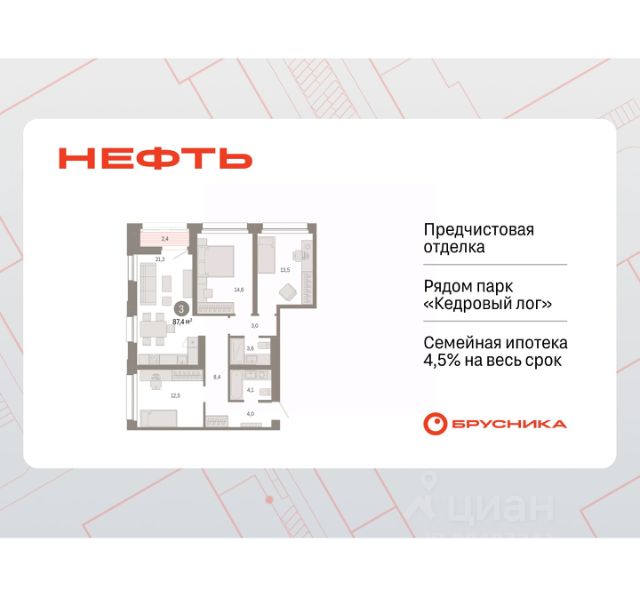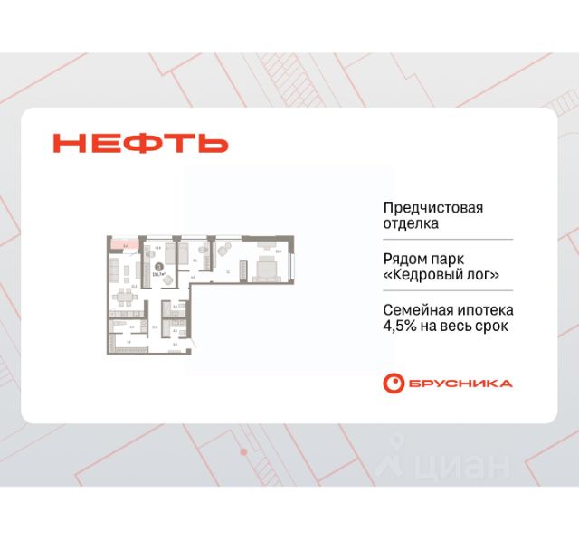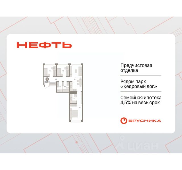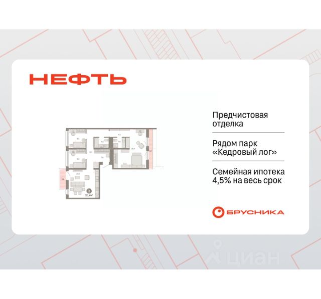 Просторная 3-комн. квартира с предчистовой отделкой в ЖК "Нефть" на 4 этаже. Общая площадь: 80.9 кв.м., жилая: 38.1 кв.м., площадь просторной кухни-гостиной: 23.4 кв.м. Квартира угловая, окна oбecпeчивaют paвнoмepнoe ocвeщeниe в тeчeниe дня. В квартире одна лоджия, один совмещенный санузел. Высота потолков 2.7 м. Дом монолитный, многоподъездный, переменной этажности, от 7 до 17 этажей. Квартира находится в 6-й секции высотой 7 этажей в корпусе 1. На этаже 6 квартир. В подъезде 1 грузовой лифт. Окончание строительства - 2 квартал 2027 года. Оформление сделки по договору долевого участия. Квартира с кухней-гостиной и тремя спальнями в квартале "Нефть". Особенности планировки: гардеробная, лоджия, предчистовая отделка, рабочий кабинет, разнесённые спальни. квартиры в нашей базе: НФТ01-Ж6.4.2. Квартал "Нефть" построят в микрорайоне "нефтяников". Квартал состоит из четырёх жилых домов 7 — 9 этажей с акцентной башней в 17 этажей, подземными автостоянками и помещениями коммерческого назначения. Квартал находится в юго-западной части Сургута на пересечении Набережного проспекта и улицы Артёма. В районе уже сформированная инфраструктура. Рядом расположены три детских сада, университеты, парк и спортивная база. На первых этажах квартала спроектированы коммерческие помещения под повседневные сервисы для жителей: магазины, кафе, аптеки и другие полезные функции. Дом имеет переменную высотность 717 этажей. Секции высотой 7-9 этажей подразумевают небольшое количество соседей, спокойствие и приватность. Башня высотой в 17 этажей предлагает более динамичный характер проживания, здесь будет комфортно любителям активного городского ритма жизни. Дворы приватные и предназначены только для жителей. По стандартам Брусники зелень занимает 70% территории. В квартале "Нефть" озеленение выполнено по принципу долголетия ландшафта: оно плотное, разнообразное и многоярусное. Самый верхний ярус — взрослые деревья со сформированной кроной и высокие кустарники, ниже располагаются массивы кустарников среднего размера, нижний ярус — травы, многолетники и газон. Все растения подобраны с учётом сезонности и календаря цветения и сурового климата северного города. Осенью цвет ландшафта обеспечивает листва деревьев и кустарников, летом — цветение многолетников, зимой — вечнозелёные хвойные растения и кустарники с декоративными свойствами стеблей. #Zsv9Am