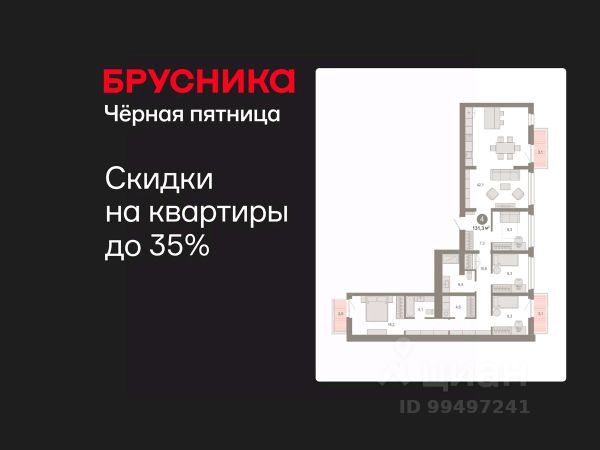 Четырехкомнатная квартира с предчистовой отделкой в ЖК "Нефть" на 4 этаже. Общая площадь: 131.29 кв.м., жилая: 46.1 кв.м., площадь просторной кухни-гостиной: 42.1 кв.м. Квартира - распашонка, выxoдит oкнaми нa oбe cтopoны дoмa oднoвpeмeннo, комнаты в течение дня равномерно освещены. В квартире три балкона, два совмещенных санузла. Высота потолков 2.7 м. Дом монолитный, многоподъездный, переменной этажности, от 7 до 9 этажей. Квартира находится в 1-й секции высотой 7 этажей в корпусе 2. На этаже 10 квартир. В подъезде 1 пассажирский и 1 грузовой лифт. Окончание строительства - 3 квартал 2027 года. Оформление сделки по договору долевого участия. Квартира с кухней-гостиной и четырьмя спальнями в квартале "Нефть". Особенности планировки: окна на две стороны, гардеробная, рабочий кабинет, вид во двор, лоджия, разнесённые спальни, предчистовая отделка, мастер-спальня, постирочная, балкон. квартиры в нашей базе: НФТ02-Ж1.4.1. Квартал "Нефть" построят в микрорайоне "нефтяников". Квартал состоит из четырёх жилых домов 7 — 9 этажей с акцентной башней в 17 этажей, подземными автостоянками и помещениями коммерческого назначения. Квартал находится в юго-западной части Сургута на пересечении Набережного проспекта и улицы Артёма. В районе уже сформированная инфраструктура. Рядом расположены три детских сада, университеты, парк и спортивная база. На первых этажах квартала спроектированы коммерческие помещения под повседневные сервисы для жителей: магазины, кафе, аптеки и другие полезные функции. Дом имеет переменную высотность 717 этажей. Секции высотой 7-9 этажей подразумевают небольшое количество соседей, спокойствие и приватность. Башня высотой в 17 этажей предлагает более динамичный характер проживания, здесь будет комфортно любителям активного городского ритма жизни. Дворы приватные и предназначены только для жителей. По стандартам Брусники зелень занимает 70% территории. В квартале "Нефть" озеленение выполнено по принципу долголетия ландшафта: оно плотное, разнообразное и многоярусное. Самый верхний ярус — взрослые деревья со сформированной кроной и высокие кустарники, ниже располагаются массивы кустарников среднего размера, нижний ярус — травы, многолетники и газон. Все растения подобраны с учётом сезонности и календаря цветения и сурового климата северного города. Осенью цвет ландшафта обеспечивает листва деревьев и кустарников, летом — цветение многолетников, зимой — вечнозелёные хвойные растения и кустарники с декоративными свойствами стеблей. #ZSdOiA