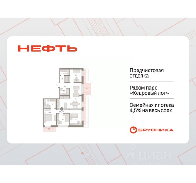 Готовые квартиры со скидкой до 35%. Информация по телефону, наши менеджеры вам все расскажут! Четырехкомнатная квартира от застройщика с предчистовой отделкой в ЖК "Новин" на 8 этаже. Общая площадь: 228.3 кв.м. Высота потолков 2.74 м. Дом монолитный, многоподъездный, переменной этажности, от 9 до 10 этажей. Квартира находится в 3-й секции высотой 9 этажей в корпусе 6. На этаже 6 квартир. В подъезде 1 пассажирский и 1 грузовой лифт. В настоящее время строительство окончено, дом сдан в 4 квартале 2022 года. Оформление сделки по договору купли-продажи. Продаётся с паркингом. Двухуровневая квартира с кухней-гостиной и четырьмя спальнями в квартале "Новин". Особенности планировки: окна на две стороны, второй санузел, окна в пол, двухуровневая, вид во двор, свободная планировка, балкон, терраса на крыше. квартиры в нашей базе: НВ3-ГП6-3-132. Квартал "Новин" расположен на западе Сургута в районе с хорошо развитой инфраструктурой. Рядом — парк "Кедровый Лог", детские сады, поликлиника, продуктовые магазины и торговые центры. До центра города — 20 минут на автомобиле. Пять домов уже заселены. Ещё три находятся на этапе возведения. Квартал находится в западной части Сургута на пересечении Югорского тракта и улицы Игоря Киртбая. Можно быстро добраться до любой точки города по Югорскому тракту. В районе уже сформированная инфраструктура. Рядом расположены крупные торговые центры, три детских сада, поликлиника, парк и спортивная база. На первых этажах квартала спроектированы коммерческие помещения под повседневные сервисы для жителей: магазины, кафе, аптеки и другие полезные функции. Проектом развития территории предусмотрено строительство детского сада и общеобразовательной школы. Во дворах предусмотрены сценарии для разных категорий жителей, в том числе и площадки для тихого отдыха с фонтаном и арт объектом. Детская площадка раскрывает игровой потенциал территории за счёт разных возможных типов взаимодействий, среди которых присутствуют: контакт с природой, смена уровня игры и контролируемый риск, сотрудничество и игра в команде, а также спокойный сценарий с качелями. Между домами второй очереди мы спроектировали общественное пространство. Здесь также расположатся спортивные и игровые площадки, велопарковки и площадь событий. Главной точкой притяжения станет фонтан. #2Mgu7i 4-комнатной квартиры первичка в Сургуте.