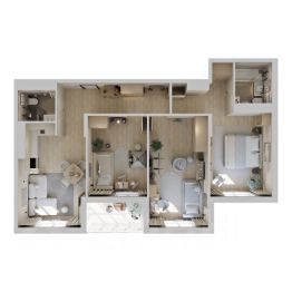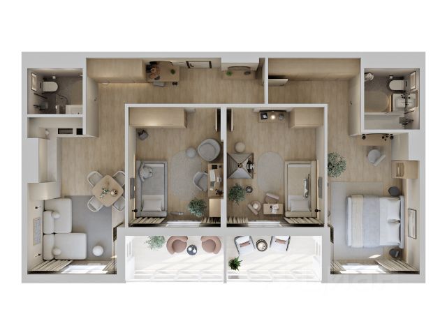 Квартира с кухней-гостиной и двумя спальнями в квартале "Новин". Особенности планировки: второй санузел, гардеробная, вид во двор, предчистовая отделка, балкон.