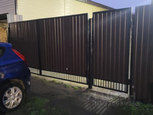 Периметр участка ограждён профнастилом, кирпичные вставки с уличными фонарями, ворота, входная калитка.