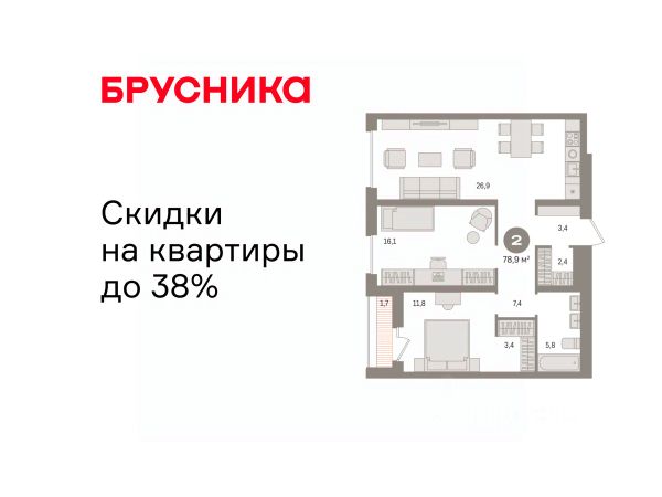 Готовые квартиры со скидкой до 35%. Информация по телефону, наши менеджеры вам все расскажут! 2-комн. квартира с предчистовой отделкой в ЖК "Новин" на 15 этаже. Общая площадь: 78.93 кв.м., жилая: 27.9 кв.м., площадь просторной кухни-гостиной: 26.9 кв.м. Комнаты изолированные, все окна выходят на одну сторону. В квартире одна лоджия, один совмещенный санузел. Высота потолков 2.7 м. Дом монолитный, многоподъездный, переменной этажности, от 8 до 17 этажей. Квартира находится в 1-й секции высотой 15 этажей в корпусе 7. На этаже 7 квартир. В подъезде 1 пассажирский и 1 грузовой лифт. Окончание строительства - 2 квартал 2027 года. Оформление сделки по договору долевого участия. Квартира с кухней-гостиной и двумя спальнями в квартале "Новин". Особенности планировки: мастер-спальня, предчистовая отделка. квартиры в нашей базе: НСВ07-Ж1.15.2. Квартал "Новин" расположен на западе Сургута в районе с хорошо развитой инфраструктурой. Рядом — парк "Кедровый Лог", детские сады, поликлиника, продуктовые магазины и торговые центры. До центра города — 20 минут на автомобиле. Пять домов уже заселены. Ещё три находятся на этапе возведения. Квартал находится в западной части Сургута на пересечении Югорского тракта и улицы Игоря Киртбая. Можно быстро добраться до любой точки города по Югорскому тракту. В районе уже сформированная инфраструктура. Рядом расположены крупные торговые центры, три детских сада, поликлиника, парк и спортивная база. На первых этажах квартала спроектированы коммерческие помещения под повседневные сервисы для жителей: магазины, кафе, аптеки и другие полезные функции. Проектом развития территории предусмотрено строительство детского сада и общеобразовательной школы. Во дворах предусмотрены сценарии для разных категорий жителей, в том числе и площадки для тихого отдыха с фонтаном и арт объектом. Детская площадка раскрывает игровой потенциал территории за счёт разных возможных типов взаимодействий, среди которых присутствуют: контакт с природой, смена уровня игры и контролируемый риск, сотрудничество и игра в команде, а также спокойный сценарий с качелями. Между домами второй очереди мы спроектировали общественное пространство. Здесь также расположатся спортивные и игровые площадки, велопарковки и площадь событий. Главной точкой притяжения станет фонтан. #zWeBTM