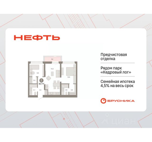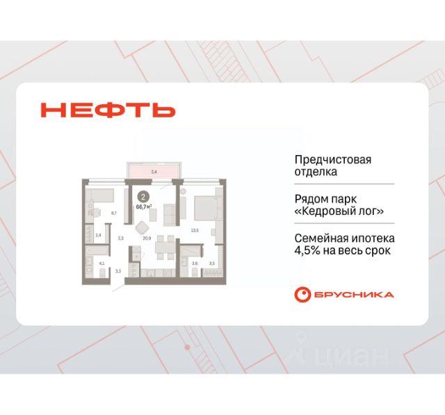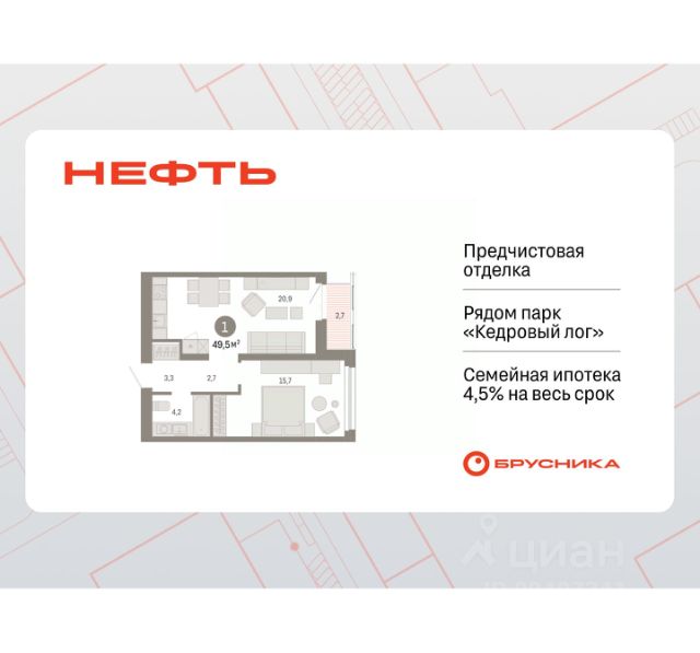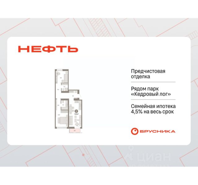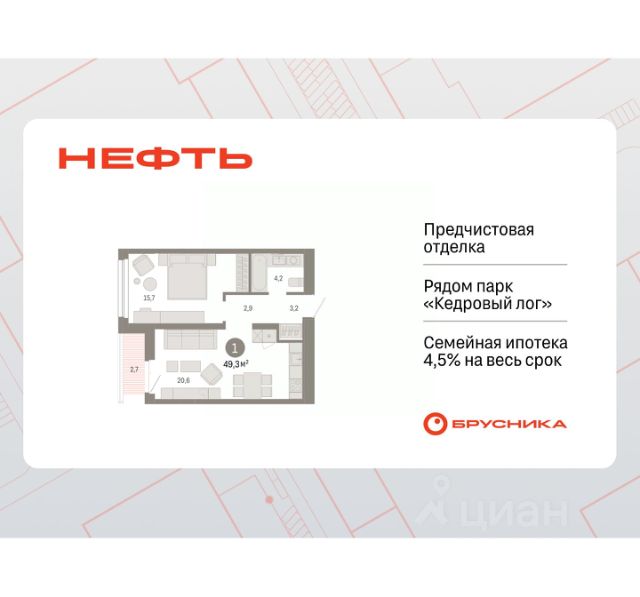 Продается однокомнатная квартира от застройщика с предчистовой отделкой в ЖК "Нефть" на 6 этаже. Общая площадь: 48.3 кв.м., жилая: 9.9 кв.м., площадь просторной кухни-гостиной: 20.8 кв.м. Все окна выходят на одну сторону. В квартире два балкона, один совмещенный санузел. Высота потолков 2.7 м. Дом монолитный, многоподъездный, переменной этажности, от 7 до 17 этажей. Квартира находится в 5-й секции высотой 7 этажей в корпусе 1. На этаже 5 квартир. В подъезде 1 грузовой лифт. Окончание строительства - 2 квартал 2027 года. Оформление сделки по договору долевого участия. Квартира с кухней-гостиной и одной спальней в квартале "Нефть". Особенности планировки: балкон, гардеробная, предчистовая отделка. квартиры в нашей базе: НФТ01-Ж5.6.3. Квартал "Нефть" построят в микрорайоне "нефтяников". Квартал состоит из четырёх жилых домов 7 — 9 этажей с акцентной башней в 17 этажей, подземными автостоянками и помещениями коммерческого назначения. Квартал находится в юго-западной части Сургута на пересечении Набережного проспекта и улицы Артёма. В районе уже сформированная инфраструктура. Рядом расположены три детских сада, университеты, парк и спортивная база. На первых этажах квартала спроектированы коммерческие помещения под повседневные сервисы для жителей: магазины, кафе, аптеки и другие полезные функции. Дом имеет переменную высотность 717 этажей. Секции высотой 7-9 этажей подразумевают небольшое количество соседей, спокойствие и приватность. Башня высотой в 17 этажей предлагает более динамичный характер проживания, здесь будет комфортно любителям активного городского ритма жизни. Дворы приватные и предназначены только для жителей. По стандартам Брусники зелень занимает 70% территории. В квартале "Нефть" озеленение выполнено по принципу долголетия ландшафта: оно плотное, разнообразное и многоярусное. Самый верхний ярус — взрослые деревья со сформированной кроной и высокие кустарники, ниже располагаются массивы кустарников среднего размера, нижний ярус — травы, многолетники и газон. Все растения подобраны с учётом сезонности и календаря цветения и сурового климата северного города. Осенью цвет ландшафта обеспечивает листва деревьев и кустарников, летом — цветение многолетников, зимой — вечнозелёные хвойные растения и кустарники с декоративными свойствами стеблей. #ZWETgT