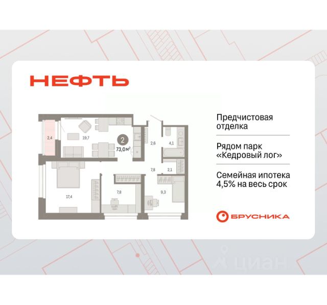 Просторная 1-комн. квартира с предчистовой отделкой в ЖК "Нефть" на 7 этаже. Общая площадь: 55 кв.м., жилая: 12.1 кв.м., площадь просторной кухни-гостиной: 29.8 кв.м. Все окна выходят на одну сторону. В квартире одна лоджия, один совмещенный санузел. Высота потолков 2.7 м. Дом монолитный, многоподъездный, переменной этажности, от 7 до 17 этажей. Квартира находится в 3-й секции высотой 17 этажей в корпусе 1. На этаже 8 квартир. В подъезде 1 пассажирский и 1 грузовой лифт. Окончание строительства - 2 квартал 2027 года. Оформление сделки по договору долевого участия. Квартира с кухней-гостиной и одной спальней в квартале "Нефть". Особенности планировки: лоджия, предчистовая отделка. квартиры в нашей базе: НФТ01-Ж3.7.6. Квартал "Нефть" построят в микрорайоне "нефтяников". Квартал состоит из четырёх жилых домов 7 — 9 этажей с акцентной башней в 17 этажей, подземными автостоянками и помещениями коммерческого назначения. Квартал находится в юго-западной части Сургута на пересечении Набережного проспекта и улицы Артёма. В районе уже сформированная инфраструктура. Рядом расположены три детских сада, университеты, парк и спортивная база. На первых этажах квартала спроектированы коммерческие помещения под повседневные сервисы для жителей: магазины, кафе, аптеки и другие полезные функции. Дом имеет переменную высотность 717 этажей. Секции высотой 7-9 этажей подразумевают небольшое количество соседей, спокойствие и приватность. Башня высотой в 17 этажей предлагает более динамичный характер проживания, здесь будет комфортно любителям активного городского ритма жизни. Дворы приватные и предназначены только для жителей. По стандартам Брусники зелень занимает 70% территории. В квартале "Нефть" озеленение выполнено по принципу долголетия ландшафта: оно плотное, разнообразное и многоярусное. Самый верхний ярус — взрослые деревья со сформированной кроной и высокие кустарники, ниже располагаются массивы кустарников среднего размера, нижний ярус — травы, многолетники и газон. Все растения подобраны с учётом сезонности и календаря цветения и сурового климата северного города. Осенью цвет ландшафта обеспечивает листва деревьев и кустарников, летом — цветение многолетников, зимой — вечнозелёные хвойные растения и кустарники с декоративными свойствами стеблей. #z4Bfsu
