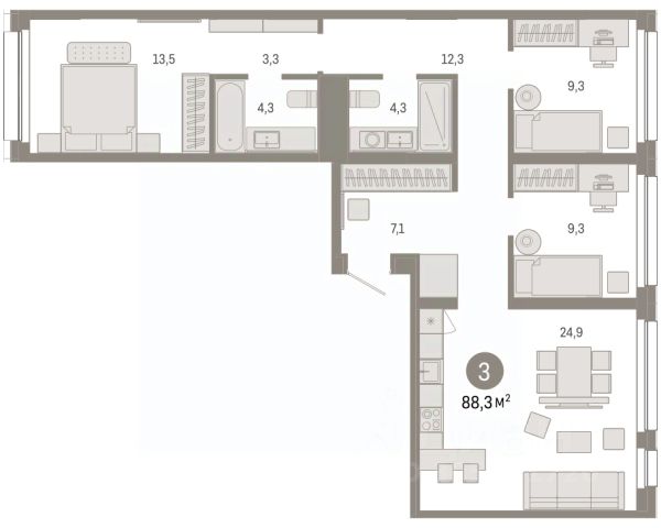 Трехкомнатная квартира с предчистовой отделкой в ЖК "Нефть" на 7 этаже. Многоуровневая квартира, на каждом этаже вы можете выделить различные функциональные зоны. Общая площадь: 122.6 кв.м., жилая: 39 кв.м., площадь просторной кухни-гостиной: 19.5 кв.м. Комнаты изолированные, все окна выходят на одну сторону. В квартире один балкон и одна лоджия, два совмещенных и один раздельный санузел. Терраса представляет собой роскошную зону отдыха, где вы на свой вкус можете создать атмосферу комфорта и уюта. Высота потолков 2.7 м. Дом монолитный, многоподъездный, переменной этажности, от 7 до 17 этажей. Квартира находится в 1-й секции высотой 7 этажей в корпусе 1. На этаже 10 квартир. В подъезде 1 грузовой лифт. Окончание строительства - 2 квартал 2027 года. Оформление сделки по договору долевого участия. Двухуровневая квартира с кухней-гостиной и тремя спальнями в квартале "Нефть". Особенности планировки: двухуровневая, свободная планировка, терраса на крыше. квартиры в нашей базе: НФТ01-Ж1.7.4. Квартал "Нефть" построят в микрорайоне "нефтяников". Квартал состоит из четырёх жилых домов 7 — 9 этажей с акцентной башней в 17 этажей, подземными автостоянками и помещениями коммерческого назначения. Квартал находится в юго-западной части Сургута на пересечении Набережного проспекта и улицы Артёма. В районе уже сформированная инфраструктура. Рядом расположены три детских сада, университеты, парк и спортивная база. На первых этажах квартала спроектированы коммерческие помещения под повседневные сервисы для жителей: магазины, кафе, аптеки и другие полезные функции. Дом имеет переменную высотность 717 этажей. Секции высотой 7-9 этажей подразумевают небольшое количество соседей, спокойствие и приватность. Башня высотой в 17 этажей предлагает более динамичный характер проживания, здесь будет комфортно любителям активного городского ритма жизни. Дворы приватные и предназначены только для жителей. По стандартам Брусники зелень занимает 70% территории. В квартале "Нефть" озеленение выполнено по принципу долголетия ландшафта: оно плотное, разнообразное и многоярусное. Самый верхний ярус — взрослые деревья со сформированной кроной и высокие кустарники, ниже располагаются массивы кустарников среднего размера, нижний ярус — травы, многолетники и газон. Все растения подобраны с учётом сезонности и календаря цветения и сурового климата северного города. Осенью цвет ландшафта обеспечивает листва деревьев и кустарников, летом — цветение многолетников, зимой — вечнозелёные хвойные растения и кустарники с декоративными свойствами стеблей. #24bfZ3 Продается квартира в микрорайоне 1-й в городе Сургут.