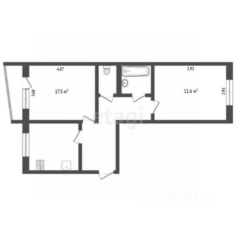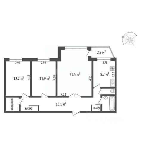 Площадь частей помещения: жилая площадь комнат: 21,8м2 и 13,6м2; кухня 8,3м2, коридор 11,3м2, ванная 2,7м2, туалет 1,3м2, кладовая 1,9м2, балкон 3,4м2. Общая площадь: 60,9м2. Высота от пола до потолка: 2.75 см.