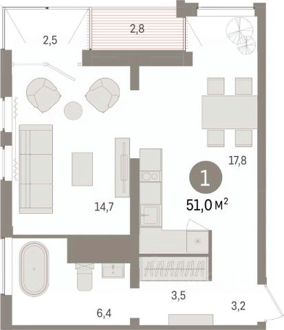 Продается однокомнатная квартира от застройщика с предчистовой отделкой в ЖК "Новин" на 7 этаже. Общая площадь: 51.26 кв.м., жилая: 16.3 кв.м., площадь просторной кухни-гостиной: 23 кв.м. Все окна выходят на одну сторону. В квартире одна лоджия, один совмещенный санузел. Высота потолков 2.7 м. Дом монолитный, многоподъездный, переменной этажности, от 8 до 17 этажей. Квартира находится во 2-й секции высотой 9 этажей в корпусе 7. На этаже 7 квартир. В подъезде 1 пассажирский и 1 грузовой лифт. Окончание строительства - 2 квартал 2027 года. Оформление сделки по договору долевого участия. Квартира с кухней-гостиной и одной спальней в квартале "Новин". Особенности планировки: лоджия, предчистовая отделка. квартиры в нашей базе: НСВ07-Ж2.7.4. Квартал "Новин" расположен на западе Сургута в районе с хорошо развитой инфраструктурой. Рядом — парк "Кедровый Лог", детские сады, поликлиника, продуктовые магазины и торговые центры. До центра города — 20 минут на автомобиле. Пять домов уже заселены. Ещё три находятся на этапе возведения. Квартал находится в западной части Сургута на пересечении Югорского тракта и улицы Игоря Киртбая. Можно быстро добраться до любой точки города по Югорскому тракту. В районе уже сформированная инфраструктура. Рядом расположены крупные торговые центры, три детских сада, поликлиника, парк и спортивная база. На первых этажах квартала спроектированы коммерческие помещения под повседневные сервисы для жителей: магазины, кафе, аптеки и другие полезные функции. Проектом развития территории предусмотрено строительство детского сада и общеобразовательной школы. Во дворах предусмотрены сценарии для разных категорий жителей, в том числе и площадки для тихого отдыха с фонтаном и арт объектом. Детская площадка раскрывает игровой потенциал территории за счёт разных возможных типов взаимодействий, среди которых присутствуют: контакт с природой, смена уровня игры и контролируемый риск, сотрудничество и игра в команде, а также спокойный сценарий с качелями. Между домами второй очереди мы спроектировали общественное пространство. Здесь также расположатся спортивные и игровые площадки, велопарковки и площадь событий. Главной точкой притяжения станет фонтан. #ZSb15z Продается квартира в микрорайоне 35-й в городе Сургут.