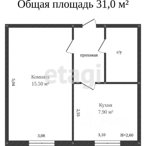 Блочный дом. Общая площадь 51,5 кв.м., жилая площадь 30,3 кв.м., кухня 7,3 кв.м.