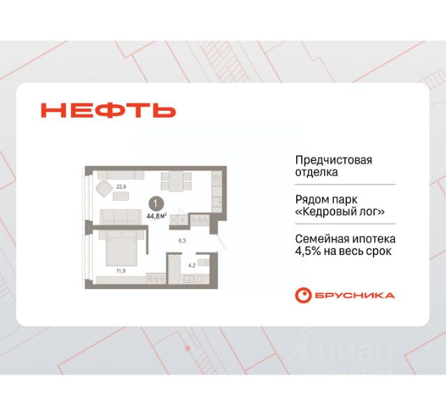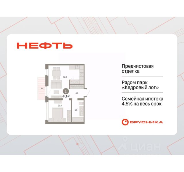1-комн. студия от застройщика с предчистовой отделкой в ЖК "Нефть" на 4 этаже. Общая площадь: 24.05 кв.м., площадь гостиной 14.6 кв.м., из которых 5 кв.м. выделено под кухонную зону. Все окна выходят на одну сторону. В квартире один балкон, один совмещенный санузел. Высота потолков 2.7 м. Дом монолитный, многоподъездный, переменной этажности, от 7 до 9 этажей. Квартира находится в 1-й секции высотой 7 этажей в корпусе 2. На этаже 10 квартир. В подъезде 1 пассажирский и 1 грузовой лифт. Окончание строительства - 3 квартал 2027 года. Оформление сделки по договору долевого участия. Студия в квартале "Нефть". Особенности планировки: лоджия, предчистовая отделка. квартиры в нашей базе: НФТ02-Ж1.4.5. Квартал "Нефть" построят в микрорайоне "нефтяников". Квартал состоит из четырёх жилых домов 7 — 9 этажей с акцентной башней в 17 этажей, подземными автостоянками и помещениями коммерческого назначения. Квартал находится в юго-западной части Сургута на пересечении Набережного проспекта и улицы Артёма. В районе уже сформированная инфраструктура. Рядом расположены три детских сада, университеты, парк и спортивная база. На первых этажах квартала спроектированы коммерческие помещения под повседневные сервисы для жителей: магазины, кафе, аптеки и другие полезные функции. Дом имеет переменную высотность 717 этажей. Секции высотой 7-9 этажей подразумевают небольшое количество соседей, спокойствие и приватность. Башня высотой в 17 этажей предлагает более динамичный характер проживания, здесь будет комфортно любителям активного городского ритма жизни. Дворы приватные и предназначены только для жителей. По стандартам Брусники зелень занимает 70% территории. В квартале "Нефть" озеленение выполнено по принципу долголетия ландшафта: оно плотное, разнообразное и многоярусное. Самый верхний ярус — взрослые деревья со сформированной кроной и высокие кустарники, ниже располагаются массивы кустарников среднего размера, нижний ярус — травы, многолетники и газон. Все растения подобраны с учётом сезонности и календаря цветения и сурового климата северного города. Осенью цвет ландшафта обеспечивает листва деревьев и кустарников, летом — цветение многолетников, зимой — вечнозелёные хвойные растения и кустарники с декоративными свойствами стеблей. #ZSdoIV