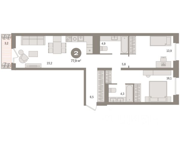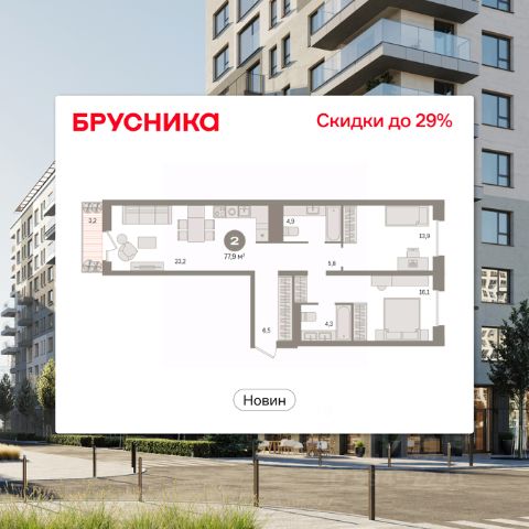 Квартира с кухней-гостиной и тремя спальнями в квартале "Новин". Особенности планировки: балкон, вид во двор, гардеробная, мастер-спальня, окна на две стороны, предчистовая отделка, разнесённые спальни.