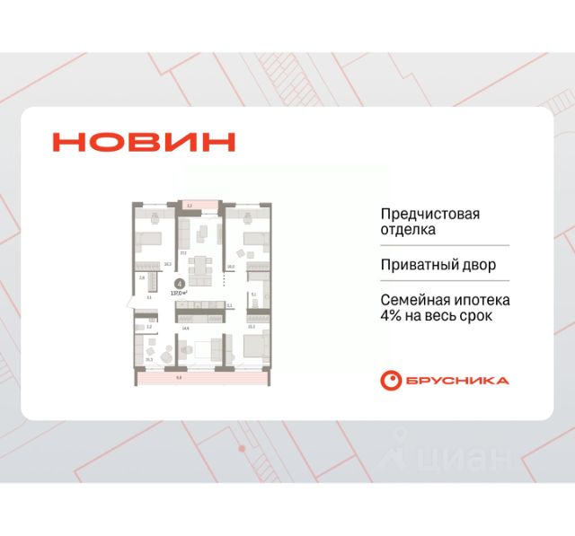 Квартира с кухней-гостиной и четырьмя спальнями в квартале "Новин". Особенности планировки: окна на две стороны, второй санузел, окно в коридоре, гардеробная, разнесённые спальни, предчистовая отделка, терраса.
