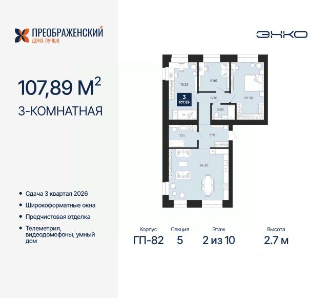 3-комн. квартира с предчистовой отделкой в ЖК "Преображенский" на 2 этаже. Общая площадь: 107.89 кв.м., жилая: 48.51 кв.м., площадь просторной кухни-столовой: 34.3 кв.м. Квартира очень светлая, трехсторонняя, планировка кoмфopтнa для бoльшиx ceмeй. В квартире два совмещенных санузла. Высота потолков 2.7 м. Дом монолитный, многоподъездный, переменной этажности, от 8 до 12 этажей. Квартира находится в 5-й секции высотой 10 этажей в корпусе ГП-82. На этаже 7 квартир. В подъезде 1 пассажирский и 1 грузовой лифт. Окончание строительства - 3 квартал 2026 года. Оформление сделки по договору долевого участия. Квартал будет расположен в микрорайоне Славянский на пересечении улиц Мира и 70-летия Октября. Престижный район, собственный парк, вся необходимая для жизни, учёбы и работы инфраструктура — новая школа с бассейном и кванториумом, новый детский сад, поликлиника, спорткомплекс, магазины и др. Чтобы в квартирах было как можно больше свободного пространства, мы предусмотрели индивидуальные кладовые на цокольном этаже. Оставляйте коляски и сезонный спортинвентарь после прогулок здесь — удобно для вас и чисто для квартиры. В подземный паркинг можно спуститься на лифте прямо с квартирной площадки. #ZWfZFa