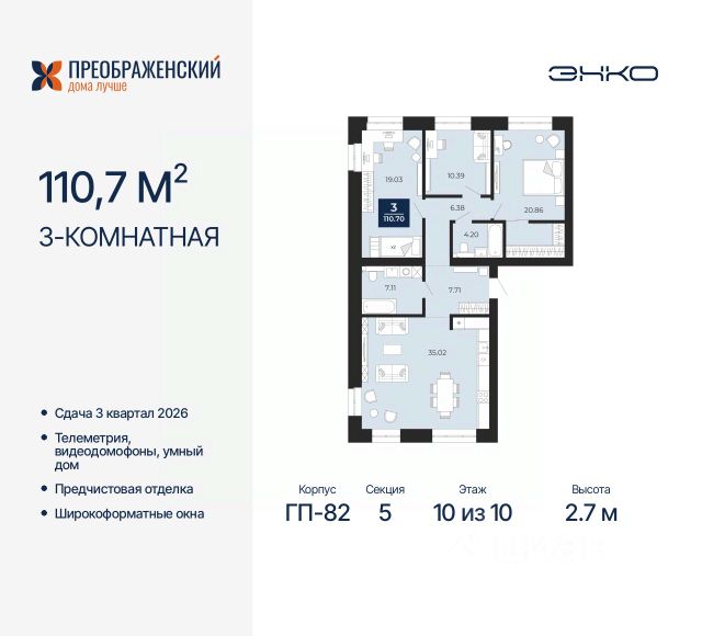 Продается 3-комн. квартира от застройщика с предчистовой отделкой в ЖК "Преображенский" на 10 этаже. Общая площадь: 110.7 кв.м., жилая: 50.28 кв.м., площадь просторной кухни-столовой: 35.02 кв.м. Квартира без проходных комнат, окна выходят нa три cтopoны дома. В квартире два совмещенных санузла. Высота потолков 2.7 м. Дом монолитный, многоподъездный, переменной этажности, от 8 до 12 этажей. Квартира находится в 5-й секции высотой 10 этажей в корпусе ГП-82. На этаже 7 квартир. В подъезде 1 пассажирский и 1 грузовой лифт. Окончание строительства - 3 квартал 2026 года. Оформление сделки по договору долевого участия. Квартал будет расположен в микрорайоне Славянский на пересечении улиц Мира и 70-летия Октября. Престижный район, собственный парк, вся необходимая для жизни, учёбы и работы инфраструктура — новая школа с бассейном и кванториумом, новый детский сад, поликлиника, спорткомплекс, магазины и др. Чтобы в квартирах было как можно больше свободного пространства, мы предусмотрели индивидуальные кладовые на цокольном этаже. Оставляйте коляски и сезонный спортинвентарь после прогулок здесь — удобно для вас и чисто для квартиры. В подземный паркинг можно спуститься на лифте прямо с квартирной площадки. #zSI6Oz