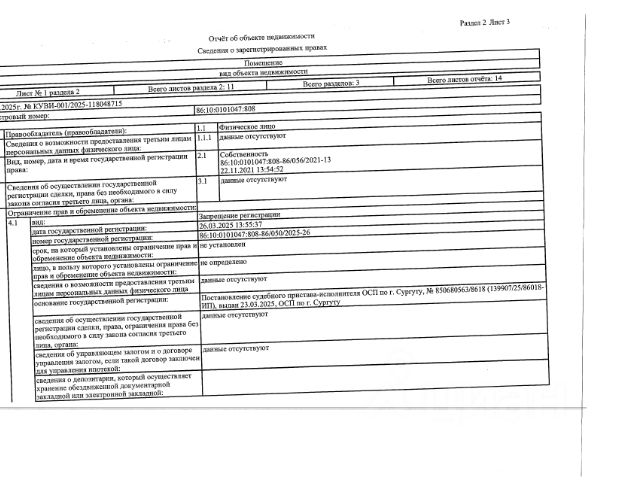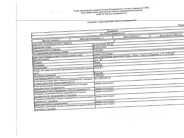 Данные получены с сайта ГИС Торги. Должник: Башков А.В., собственник: Башков А.В. Лот: Жилое помещение, квартира, площадь 23,4 кв.м., кадастровый номер 86:10:0101047:808, зарегистрировано 2 взрослых, 1 ребенок, задолженность по кап. ремонту на 01.06.2025 - 15 т.р., г. Сургут, ул. Крылова, д.32, кв.871, н/ц: 1953062,68 р., з-к: 1953р., код: 0014, рег. 25-312;