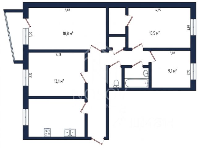 Продается 4х-комнатная квартира в центральном районе города Сургута. Квартира расположена на 1-м этаже 5-этажного дома. Общая площадь квартиры составляет 88,7 кв.м, высота потолков — 2,75 метра.