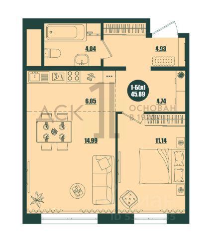 Продаётся 1-комнатная квартира в строящемся доме (Дом 4.2), срок сдачи: I-кв. 2026, общей площадью 45.89 кв.м., на 14 этаже. Новый жилой комплекс "Крылов" от застройщика "ДСК-1" расположен по адресу: г. Сургут, улица Крылова.
