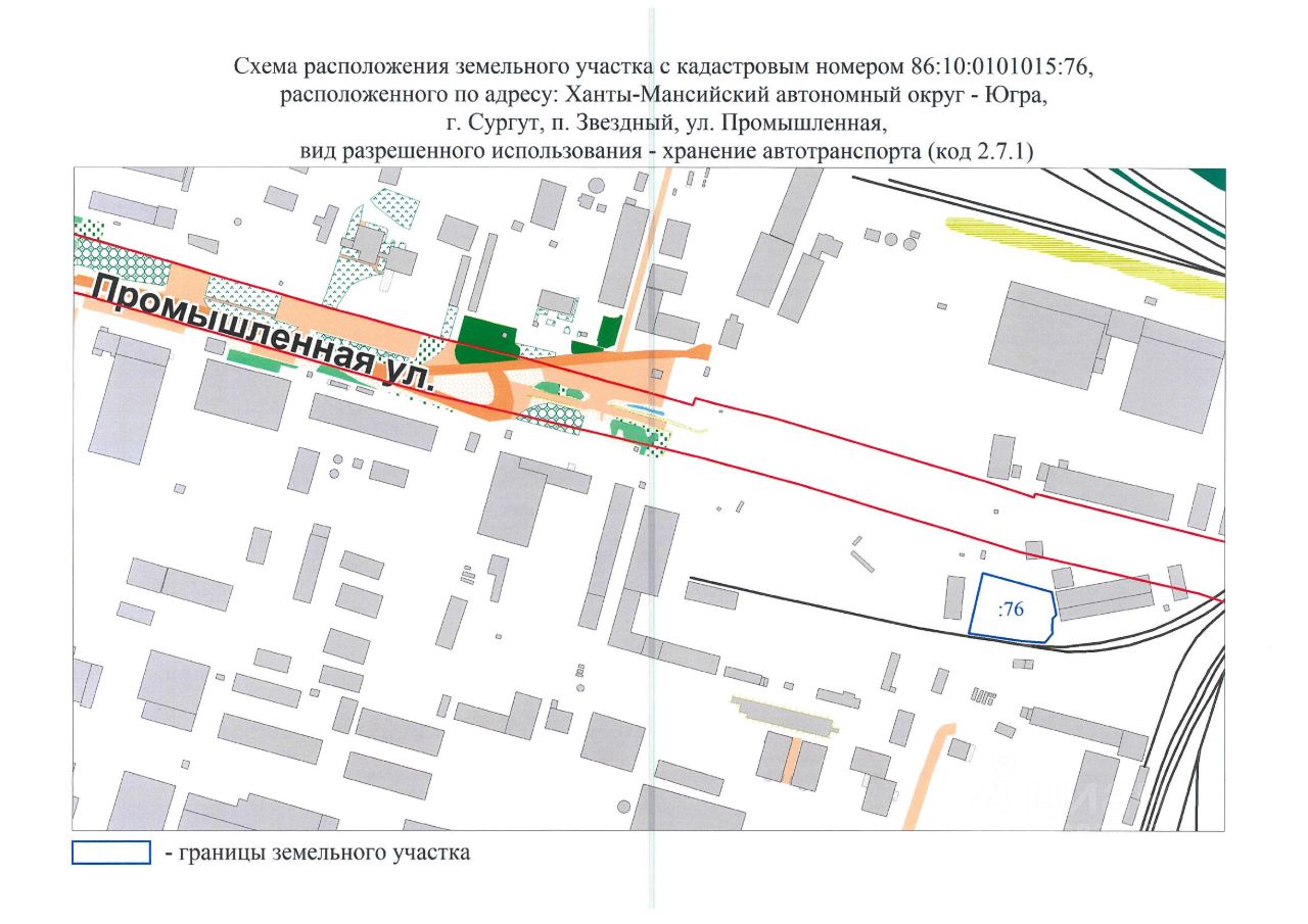 Земельный участок с кадастровым номером 86:10:0101015:76, площадью 2 258 кв. метров, местоположение: Ханты-Мансийский автономный округ Югра, город Сургут, поселок Звездный, улица Промышленная, категория земель земли населенных пунктов, вид разрешенного использования хранение автотранспорта (код 2.7.1). Восстановление зеленых насаждений 50 996,76 руб. Аренда земельного участка 58 месяцев, срок строительства объекта 29 месяцев.
